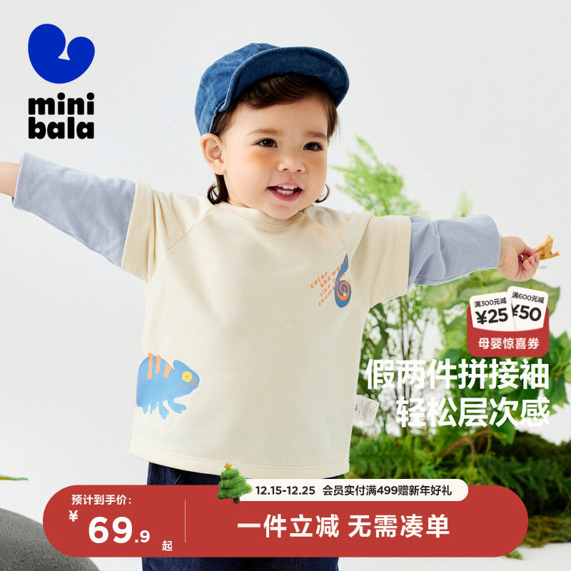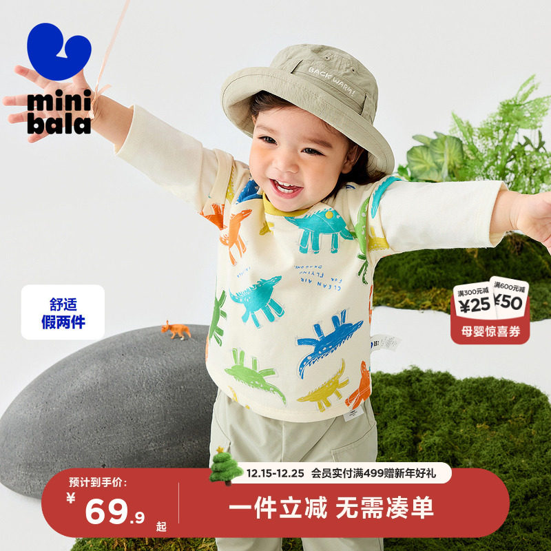 【假两件】迷你巴拉巴拉男童T恤2025秋撞色长袖恐龙宝宝打底上衣