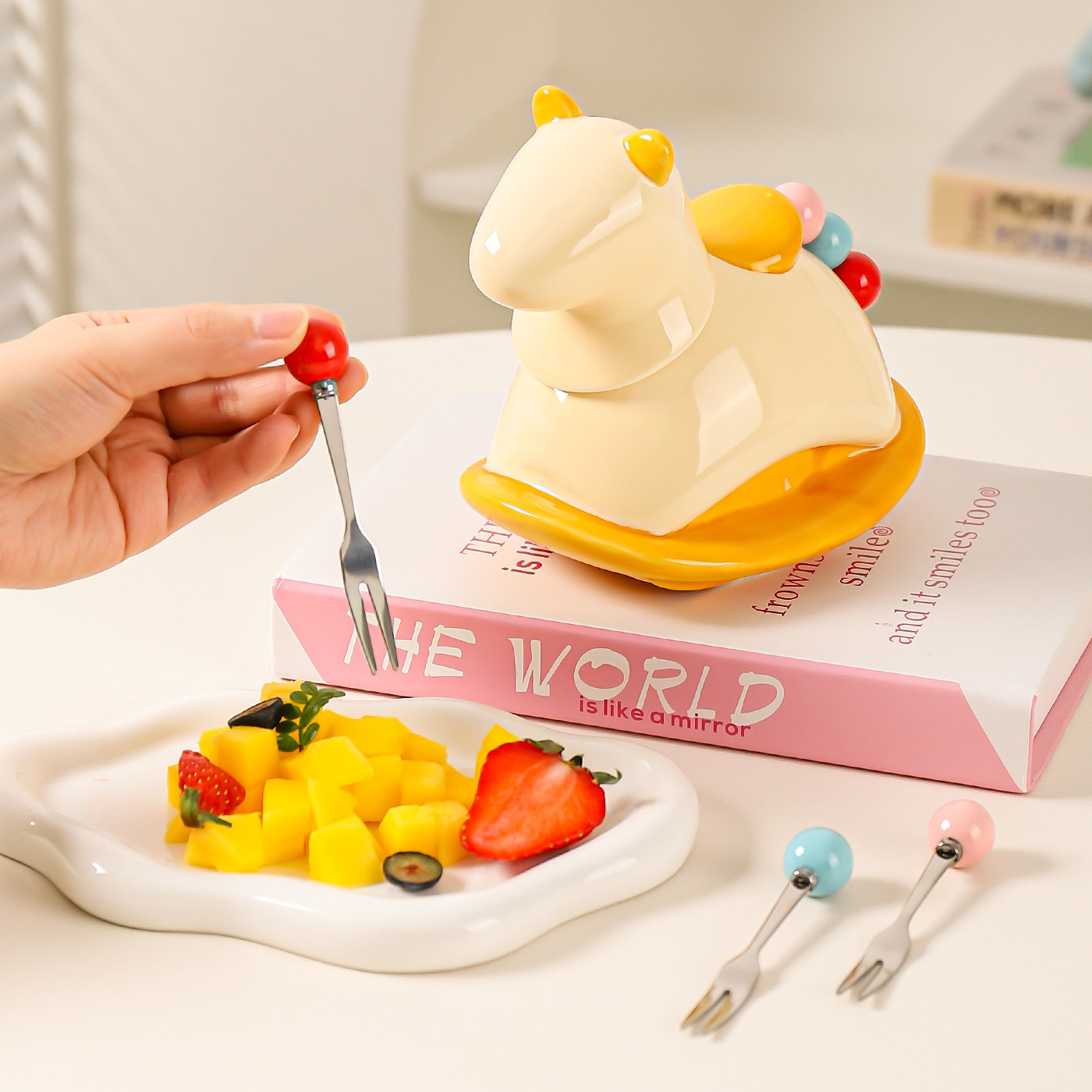 川岛屋摇摇马不锈钢水果小叉子套装果签收纳罐牙签筒马年新年礼物
