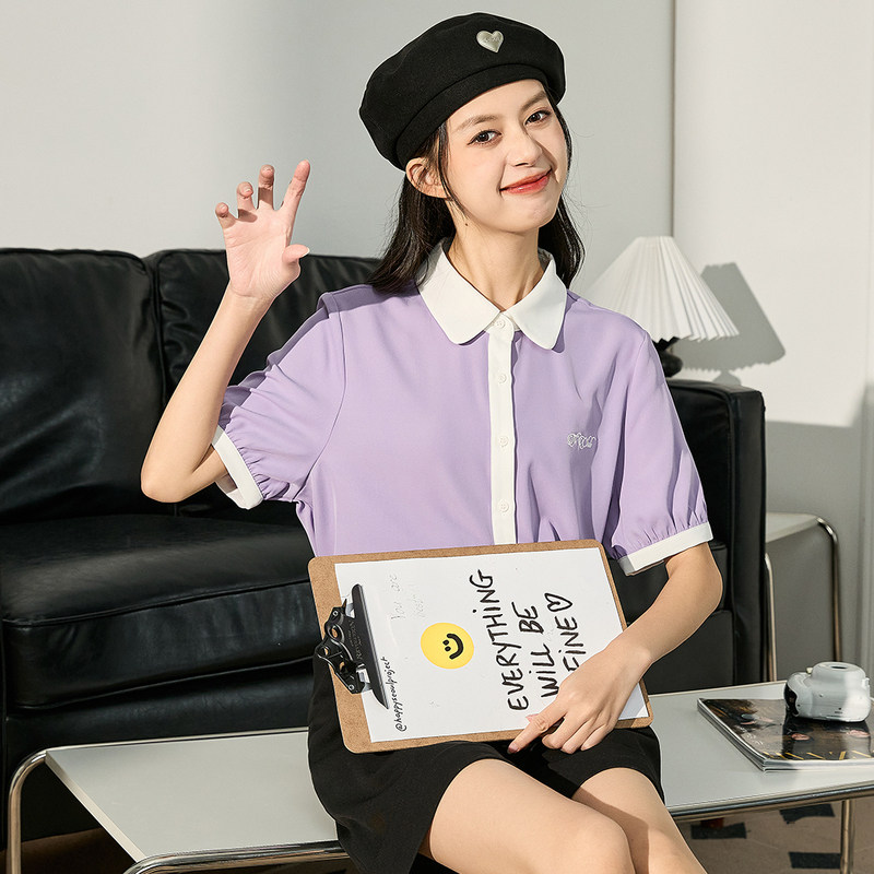唐狮短袖衬衫夏季女拼接撞色设计感甜美小衫简约上衣polo领紫色