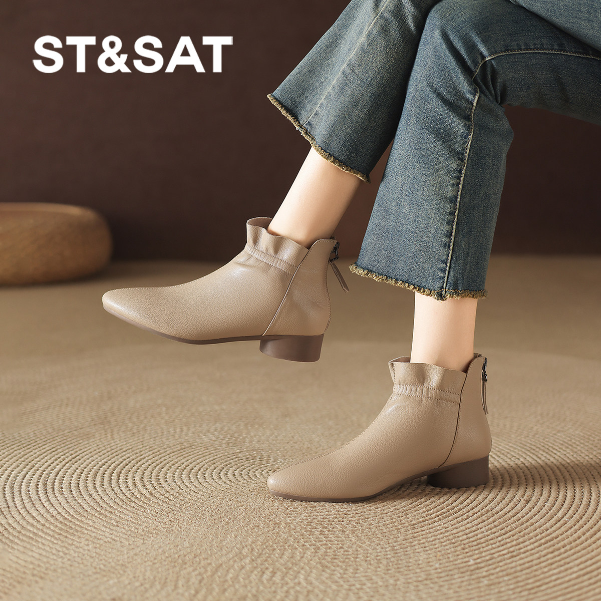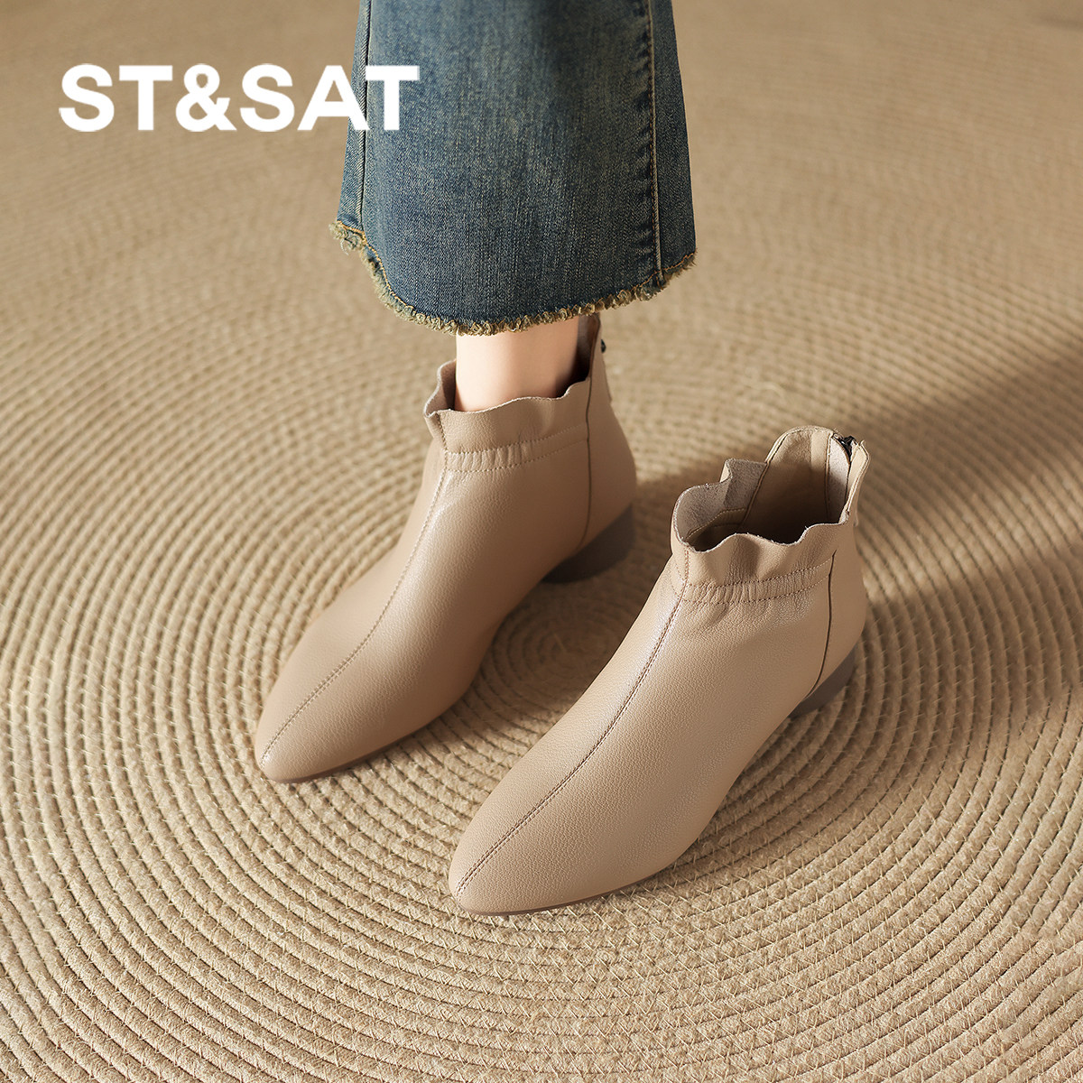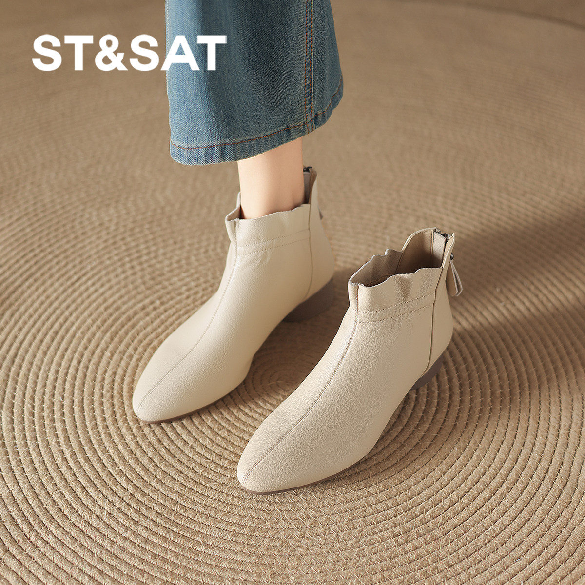 星期六尖头白色瘦瘦小短靴2025新款女款秋冬季加绒踝靴马丁女靴子