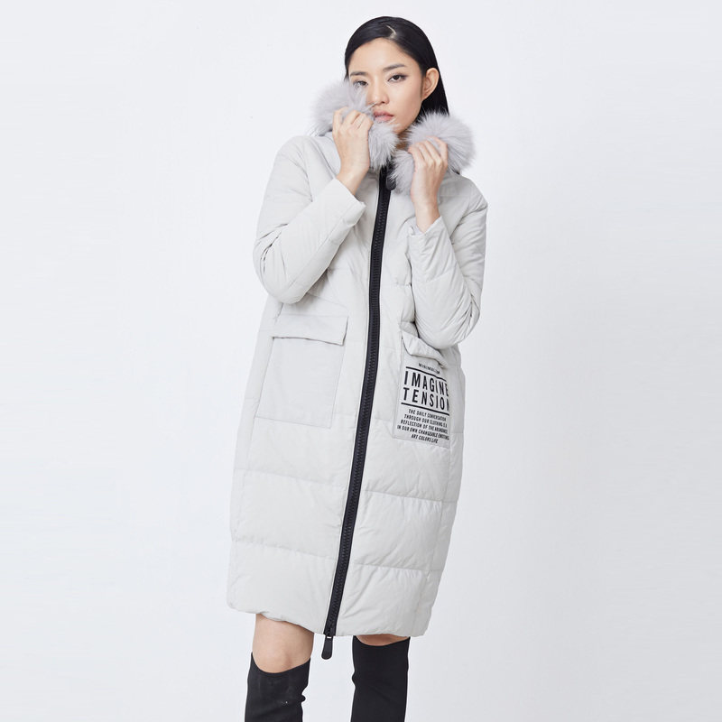 S·DEER圣迪奥女装毛领连帽撞色字母长款羽绒服S214Z2433
