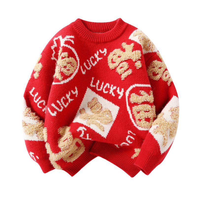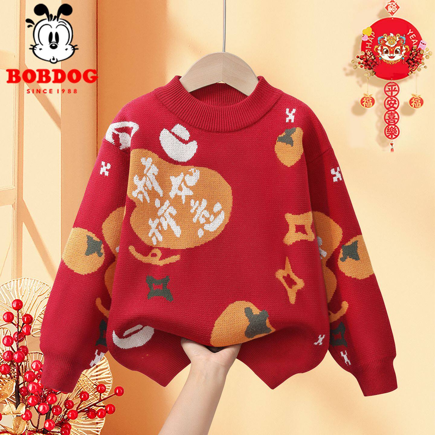 巴布豆儿童红色毛衣秋冬款2026女童拜年服男童过年服新年衣服马年