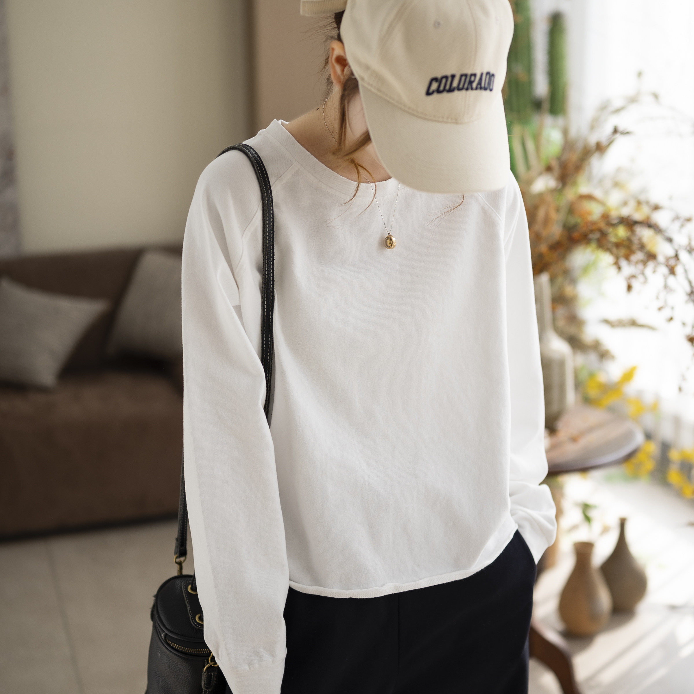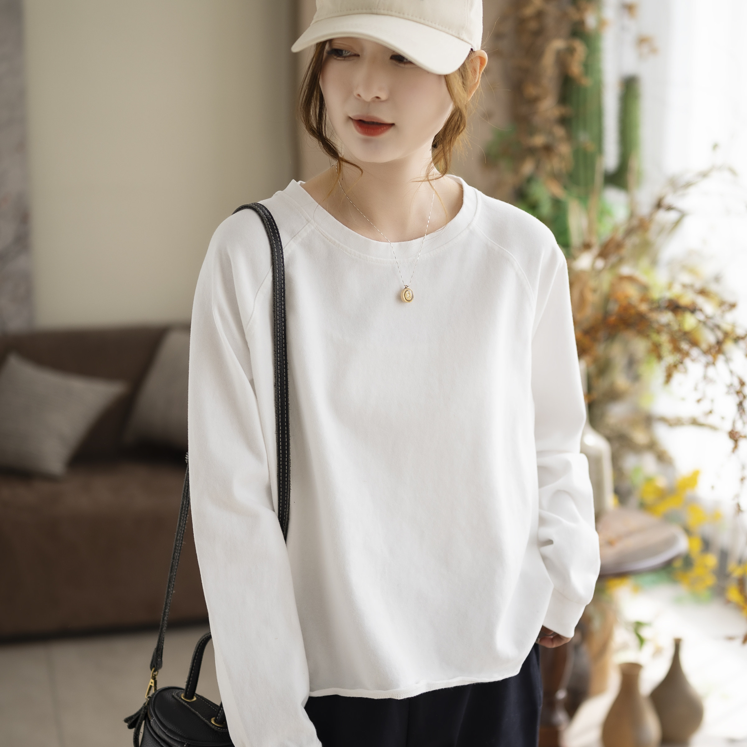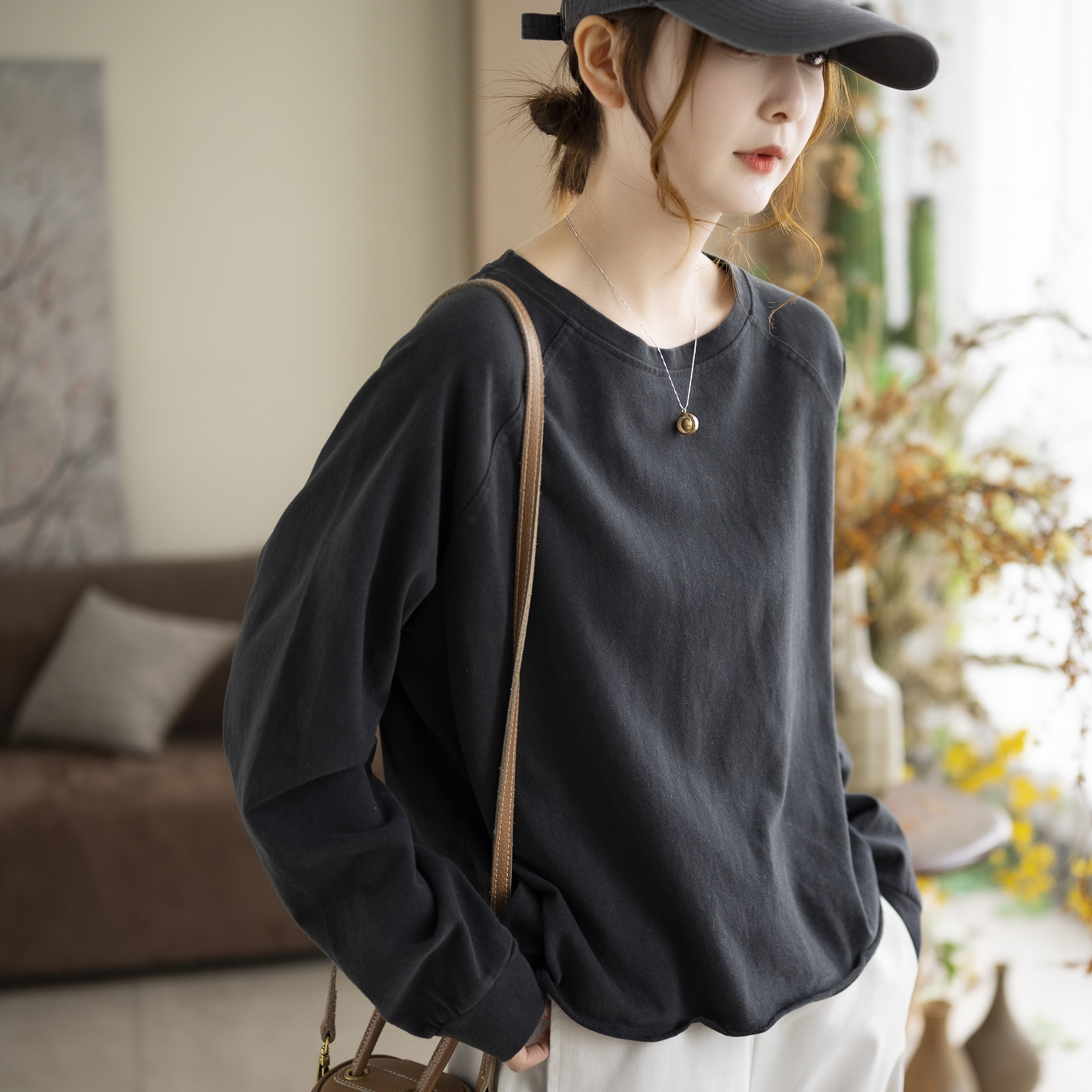 咖咪羽打底衫女新款早春女士圆领纯色文艺显瘦宽松百搭通勤女装