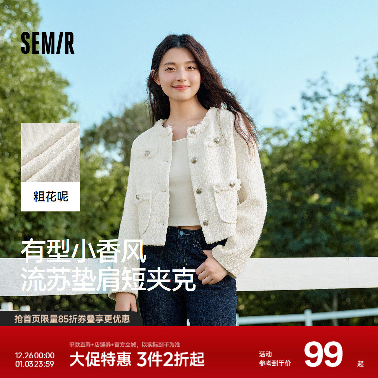 森马外套女短款垫肩流苏优雅温柔秋2024新款小香风修身粗花呢夹克