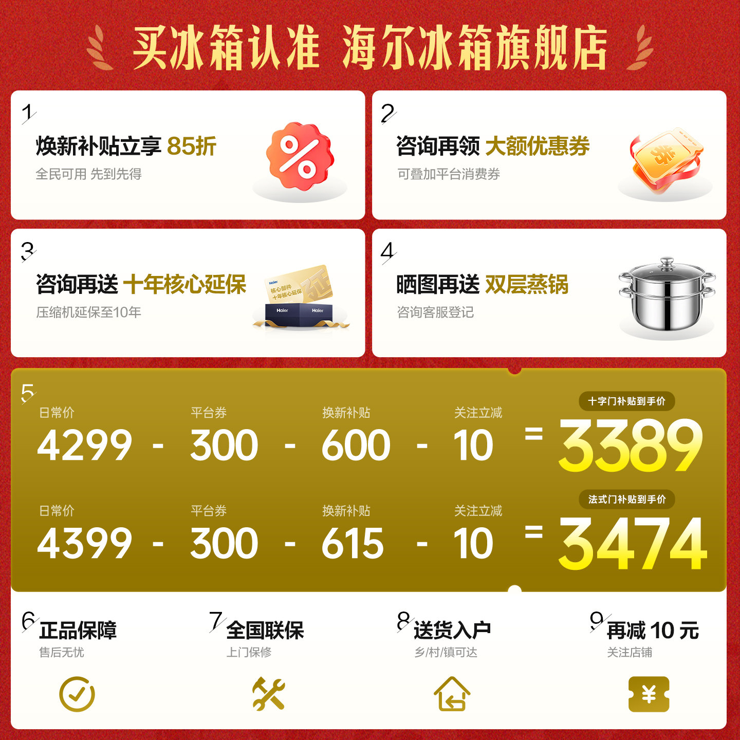 海尔冰箱以旧换新补贴476L十字双开门大容量家用一级能效无霜官方