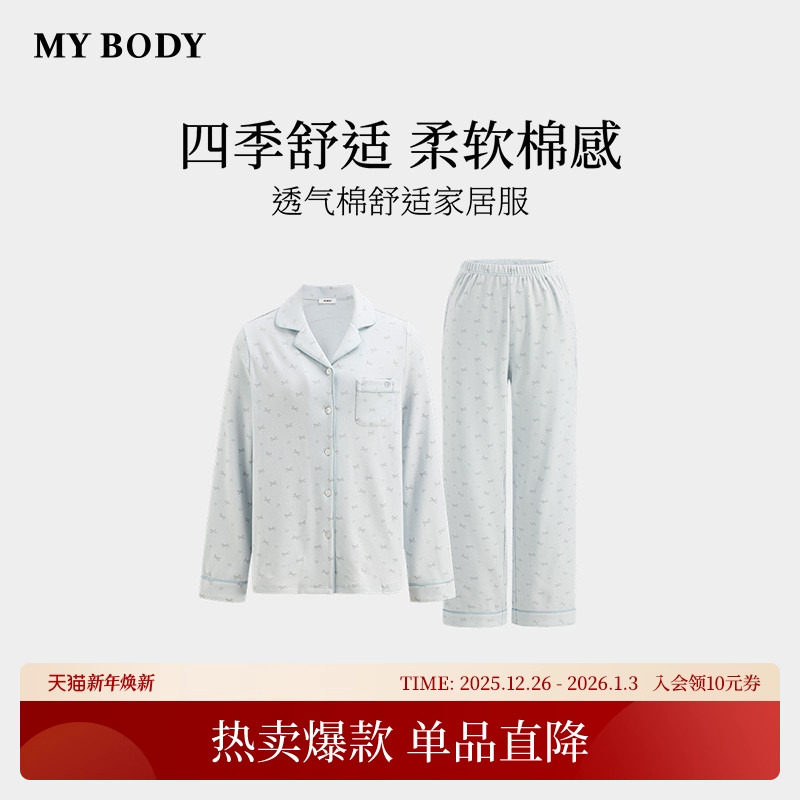 商场同款MYBODY秋季新款睡衣女简约清新印花长袖套装棉舒适家居服