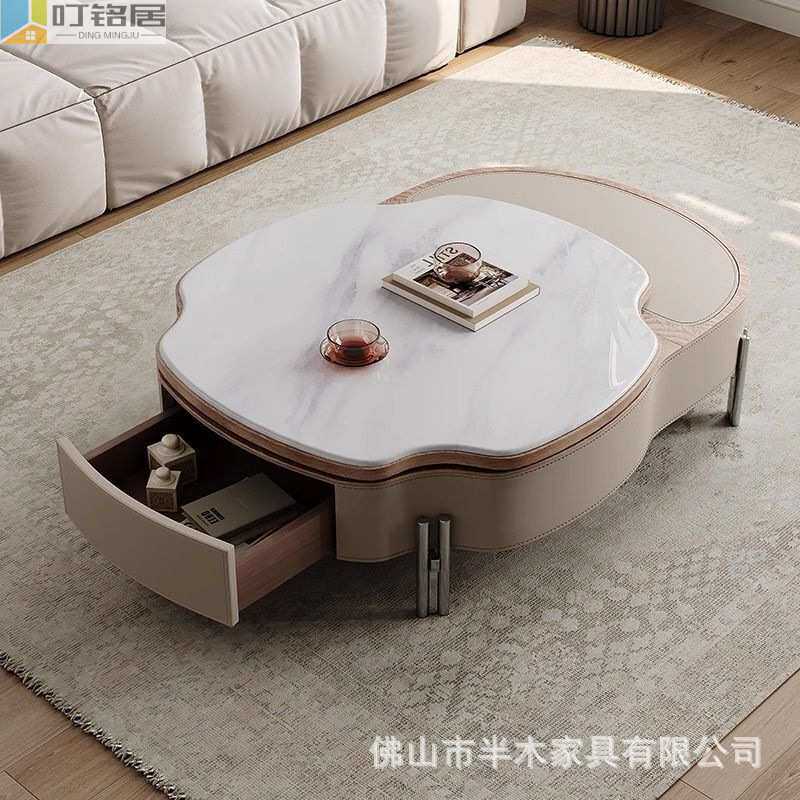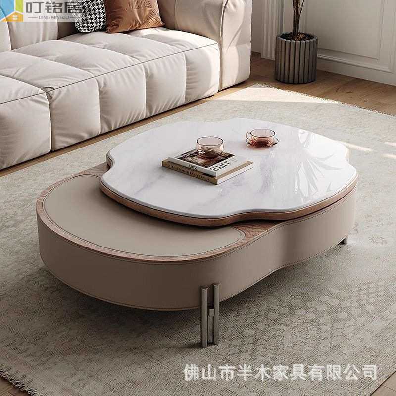 新款轻奢意式极简小户型家用客厅马鞍皮升降微晶石茶几