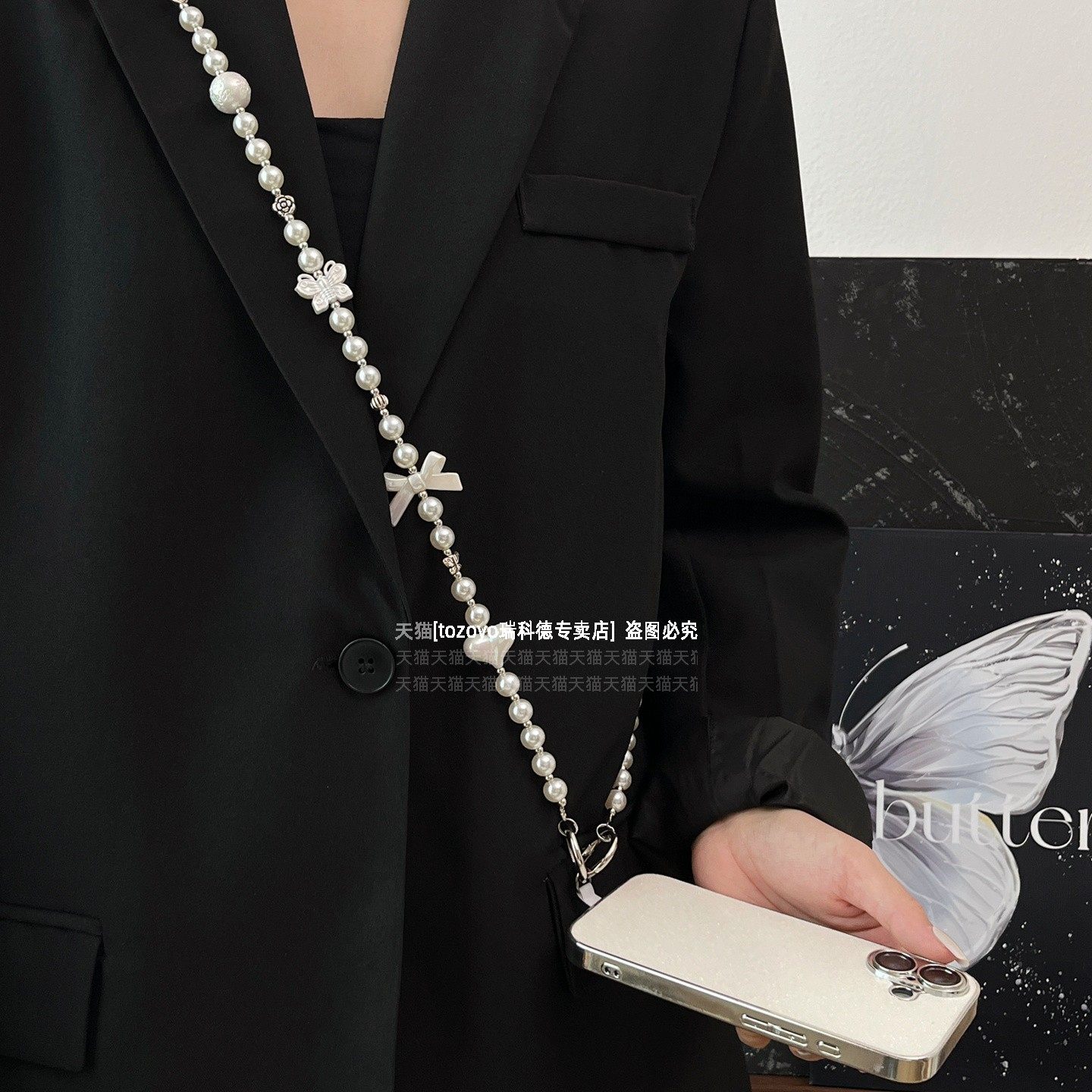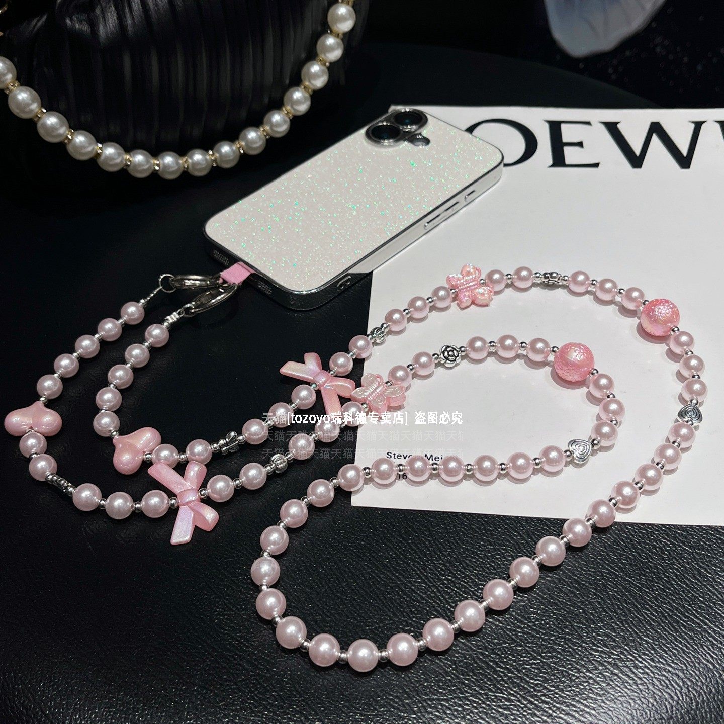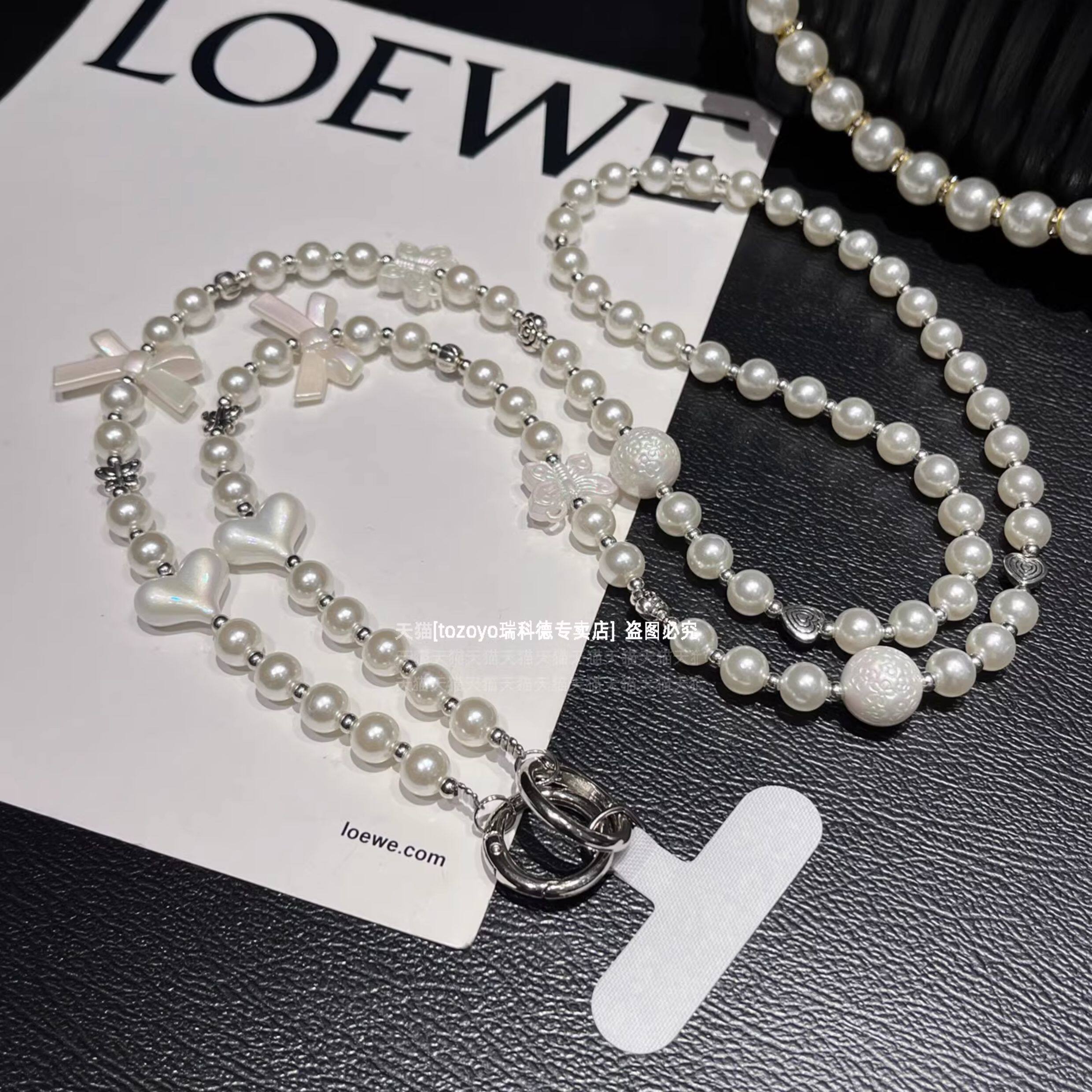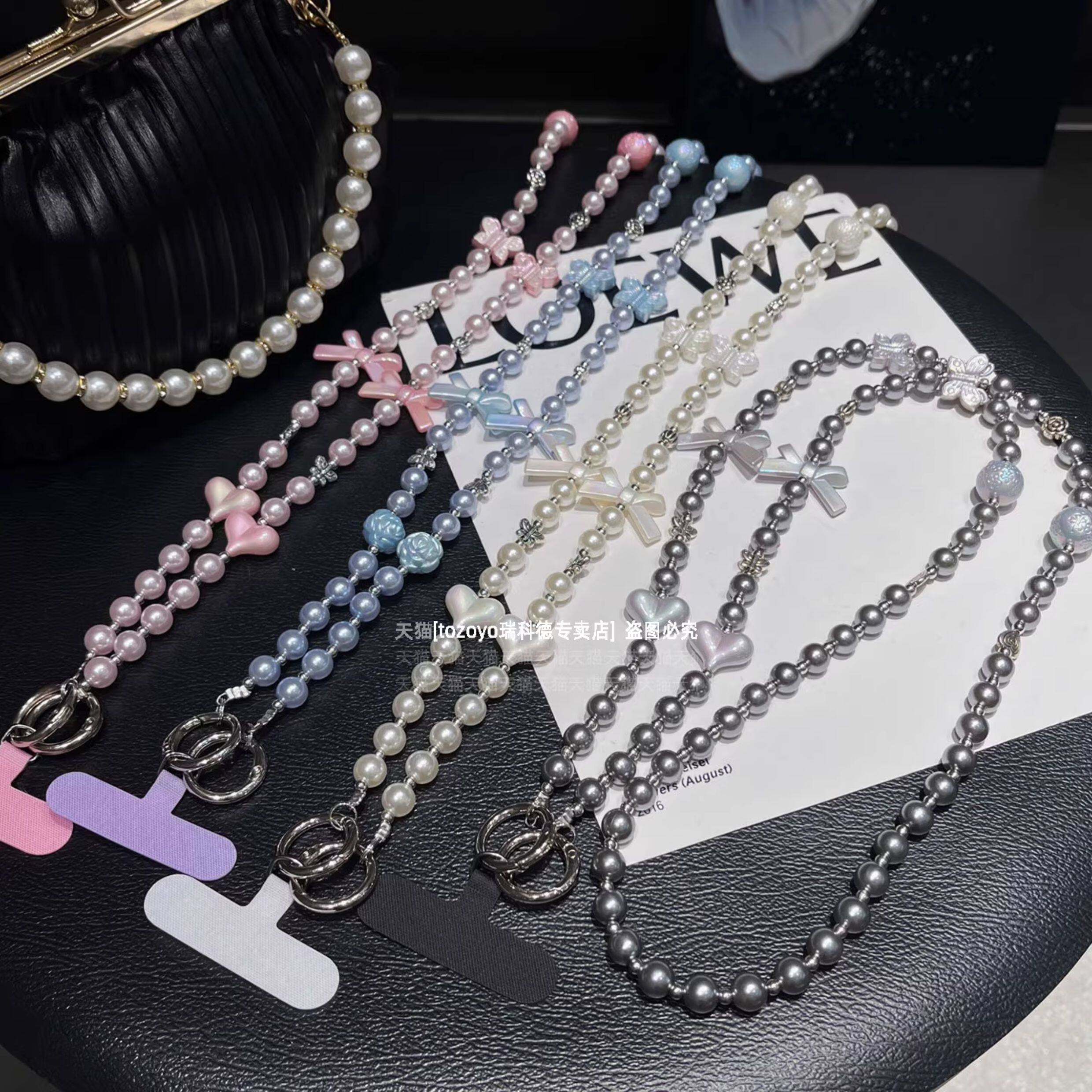 斜挎珍珠手机链小众高级感长款链条爱心蝴蝶结手工串珠背带挂链包包相机挂饰防丢绳链子斜背肩带精致女卡垫壳