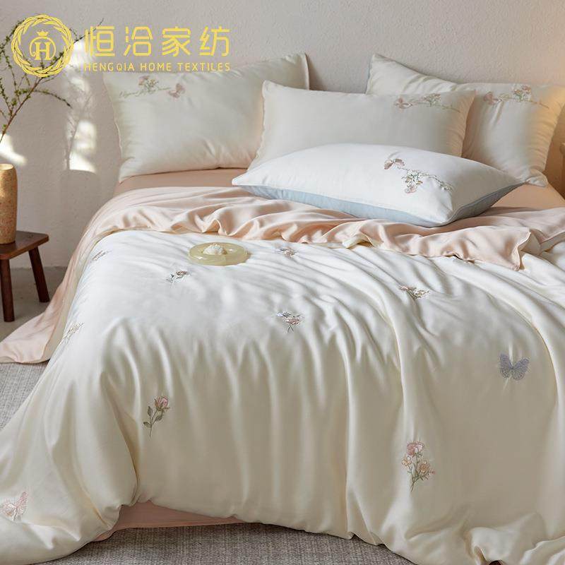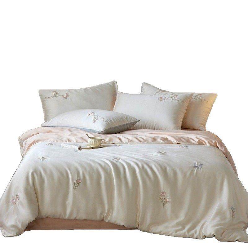 春夏凉感莱赛尔四件套唯美花卉刺绣丝滑少女心1.2m被套床品粉蓝色