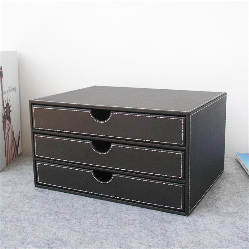 商务办公桌面文件柜A4文件收纳柜文件资料抽屉柜皮革高档柜子黑色