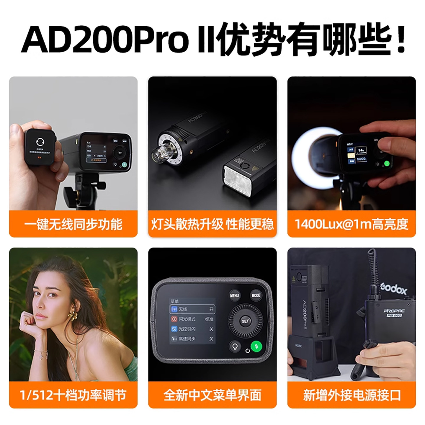 (全新二代)godox神牛AD200pro II二代外拍闪光灯锂电池单反相机TTL高速同步摄影灯户外便携一代口袋双灯头