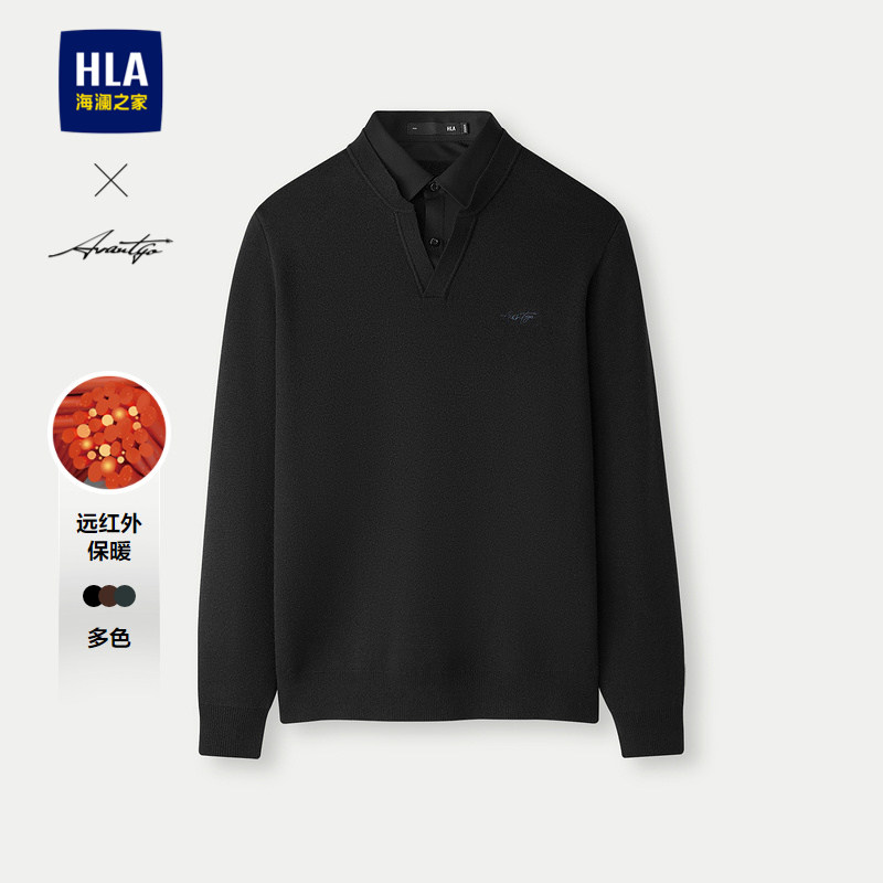 HLA/海澜之家轻商务稍厚加绒假两件针织衫秋冬新款双领黑色毛衣男