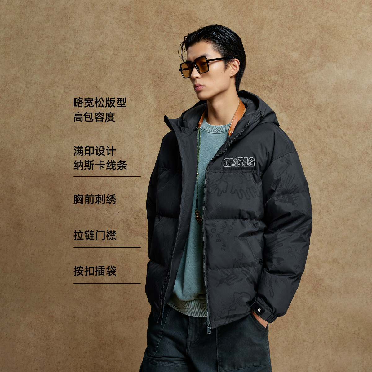 廓形;抽绳连帽;拉链门襟;衣身印花
