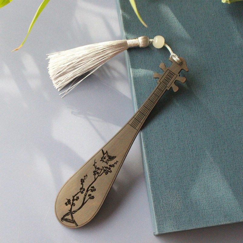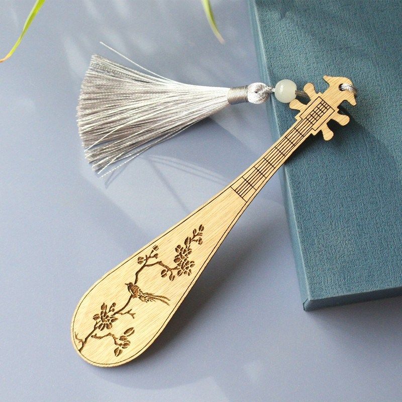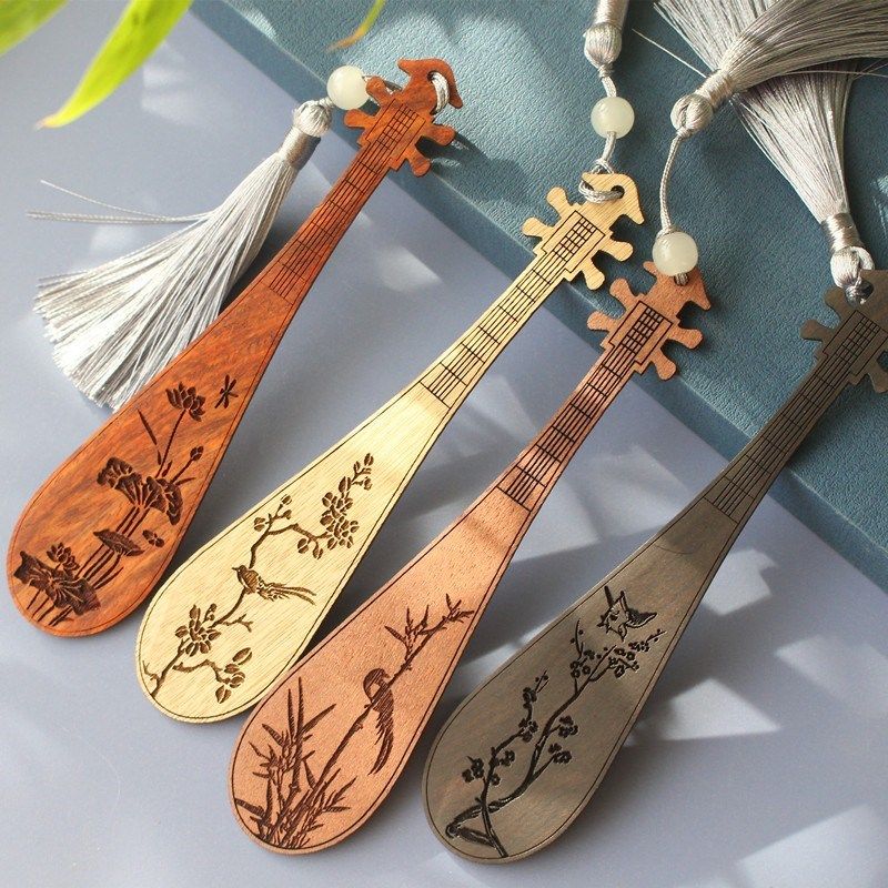 檀木琵琶书签红木花鸟创意古琴四色书签礼品出国送礼教师节礼