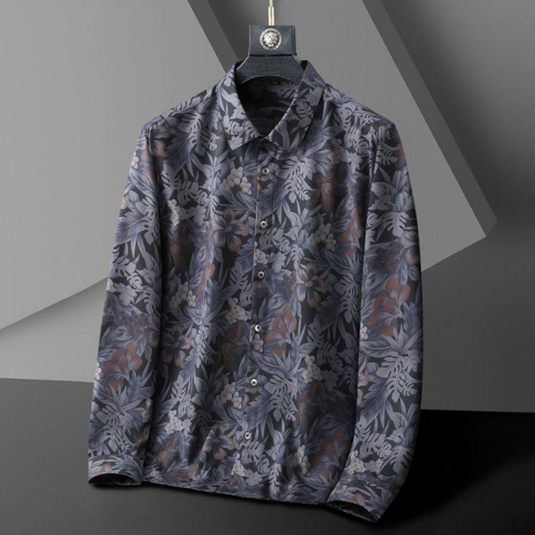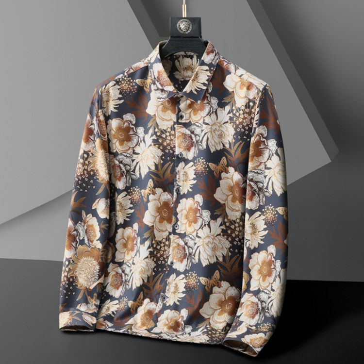 特大码高级胖子碎花长袖衬衫男加肥加大宽松衬衣短袖印花港风红色