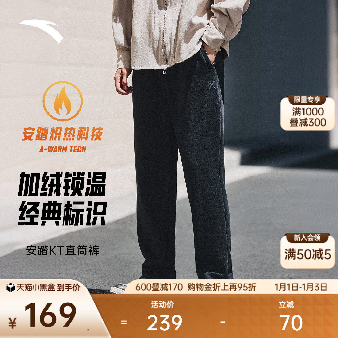 安踏KT运动长裤男士冬季新款加绒保暖阔腿直筒裤子卫裤152541302P