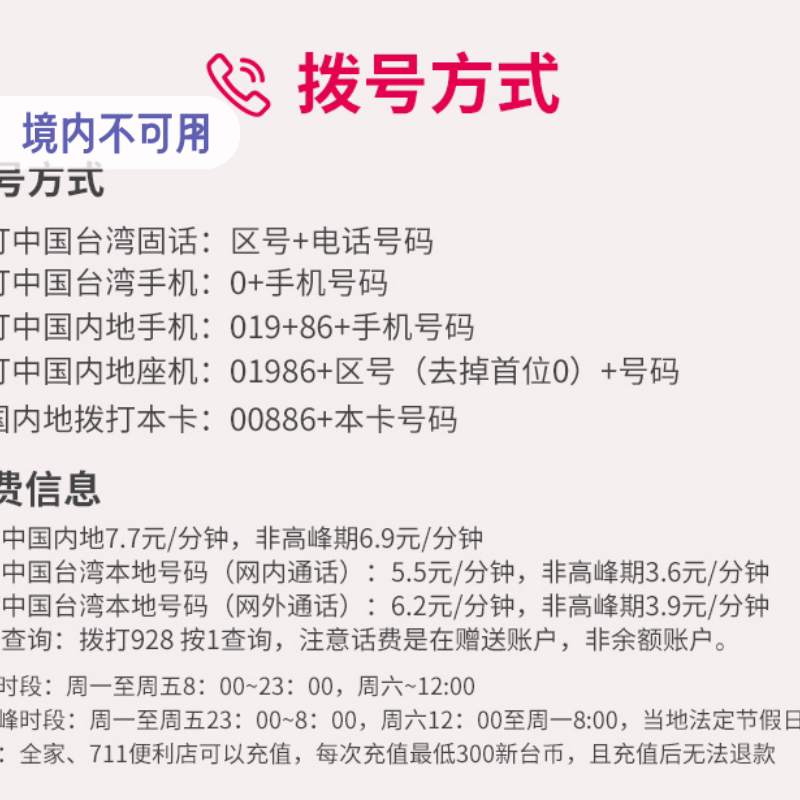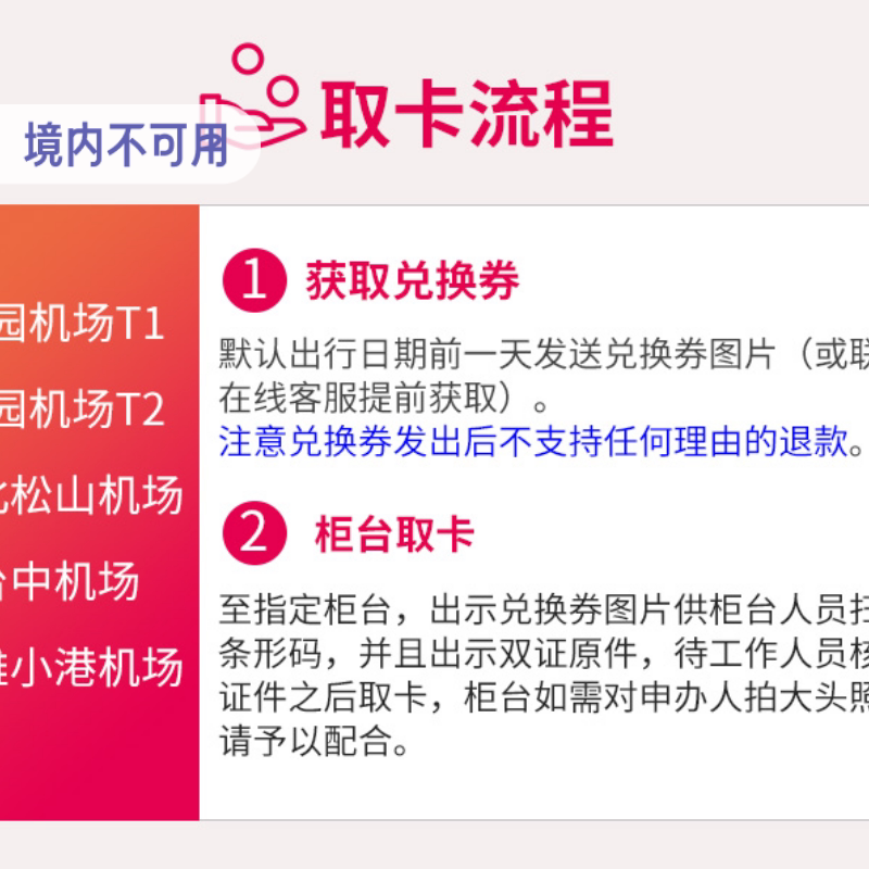 台湾5大机场自取,中华电信原生卡,4G无限流量 取卡时需要提供双证,取卡当天免费使用,次日算天数