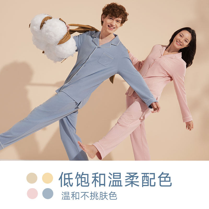 安比斯情侣睡衣舒适纯棉秋季女长袖男女同款休闲家居服套装可出门