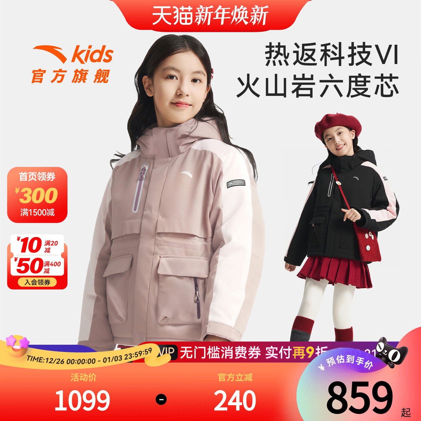 火山岩六度芯安踏儿童女大童羽绒服2025冬新款保暖户外四防羽绒服
