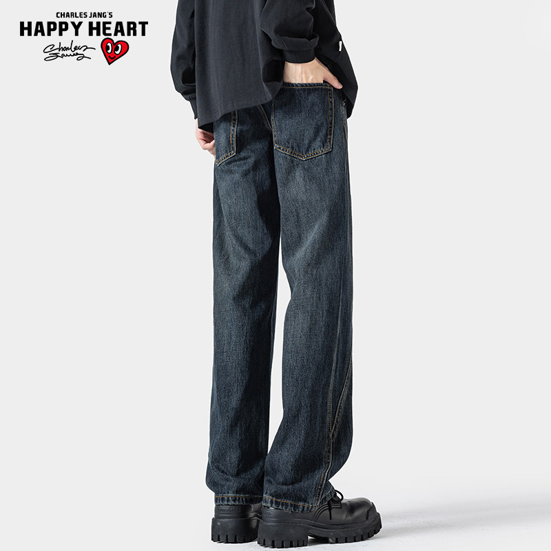 查尔斯桃心 美式复古拼接牛仔裤男春秋冬季水洗加绒休闲直筒长裤