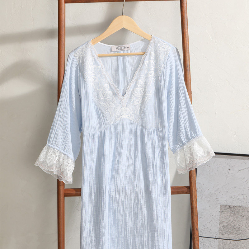 【断码清仓】美标春夏七分袖纯棉睡裙女公主风双层棉纱蕾丝家居服