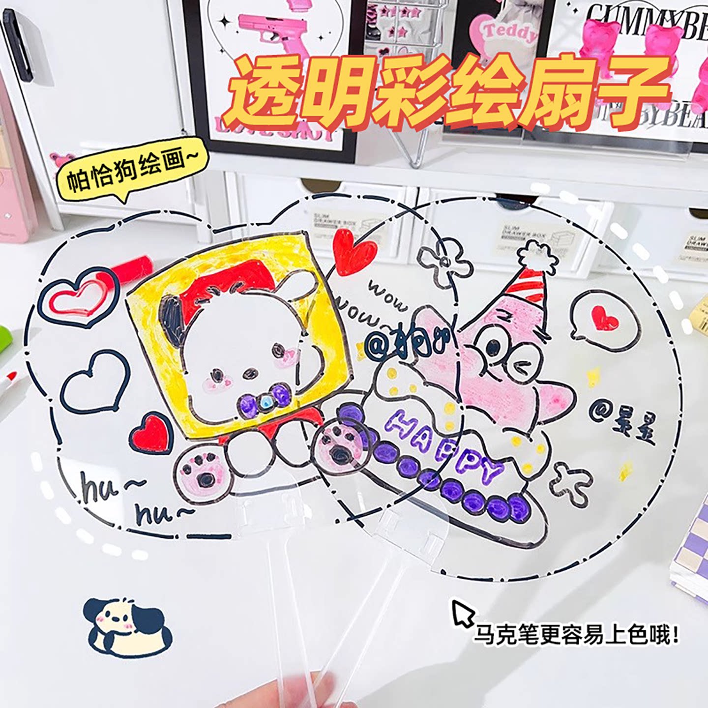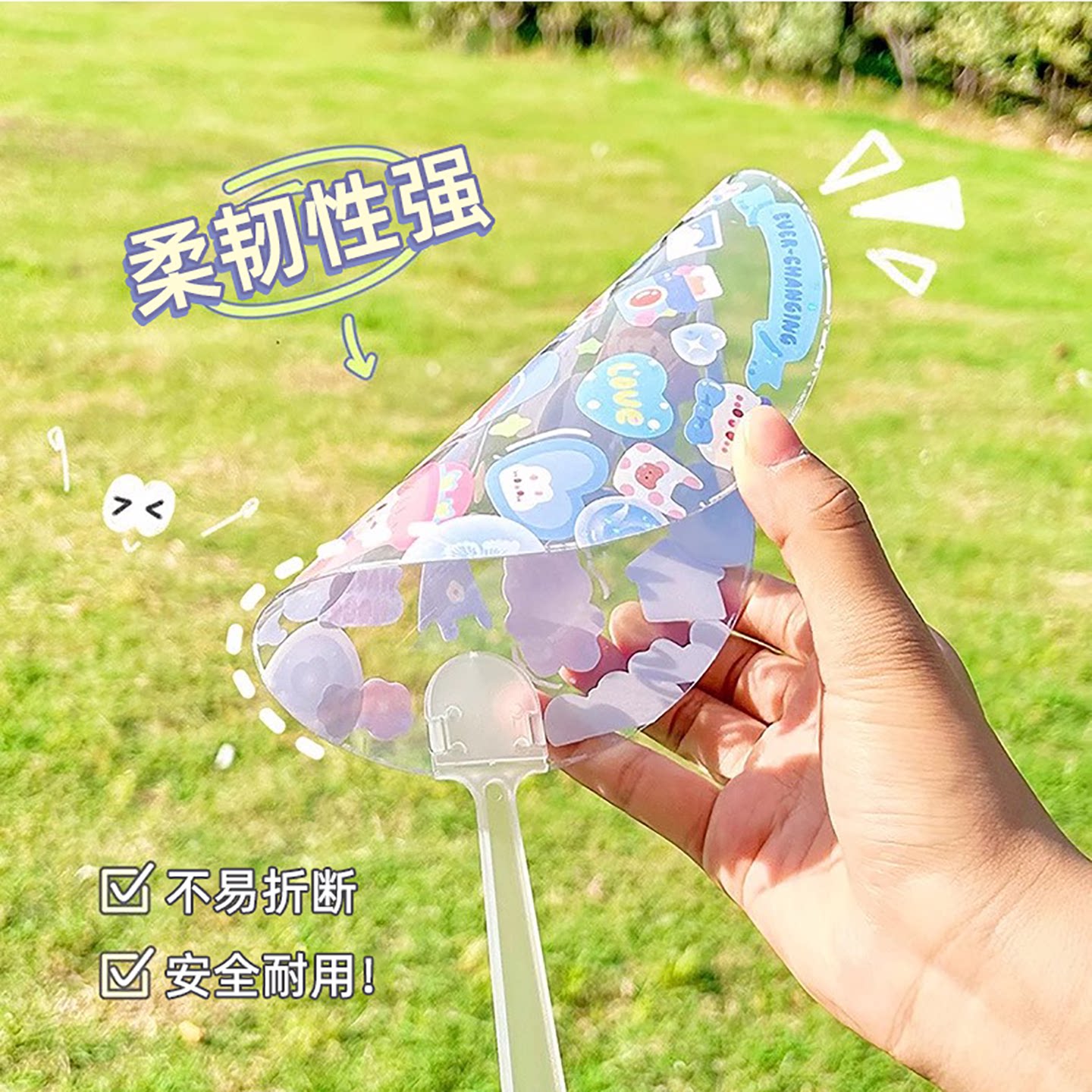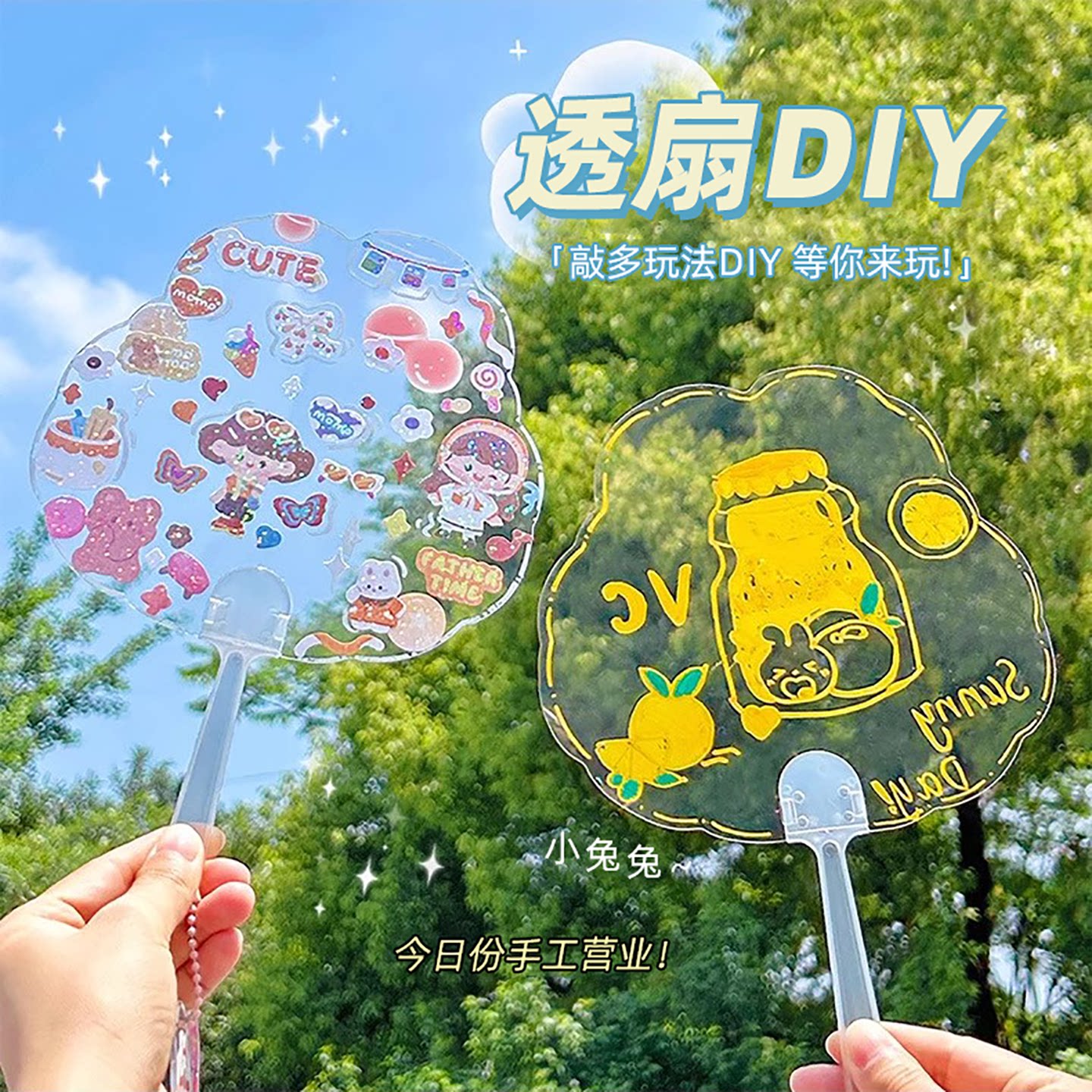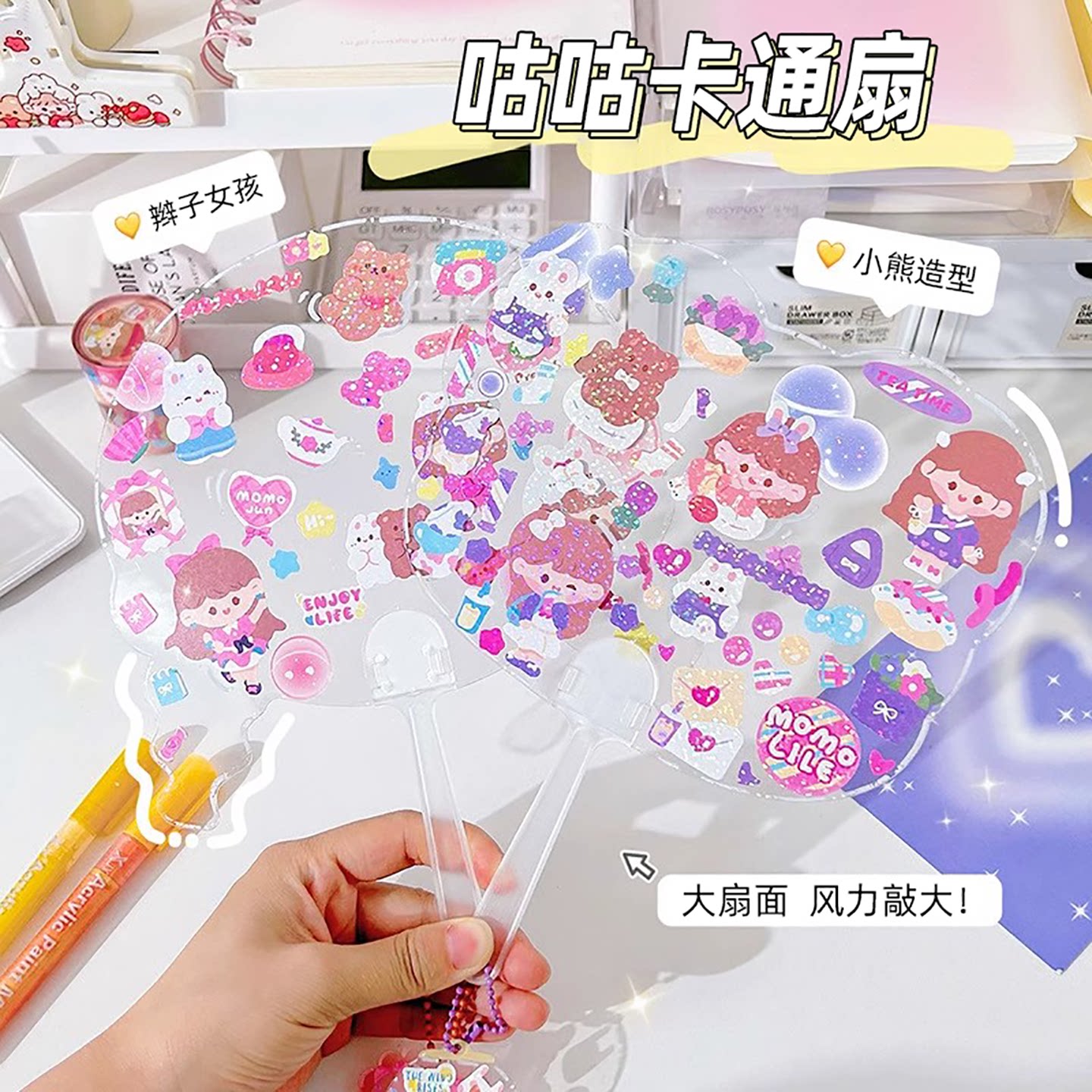 DIY透明咕卡扇子空白儿童手工手摇扇创意爱豆PP透明扇绘画扇大号玩具女孩制作材料咕咔手帐贴纸贴画古卡迷你