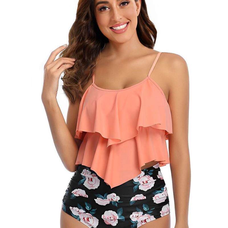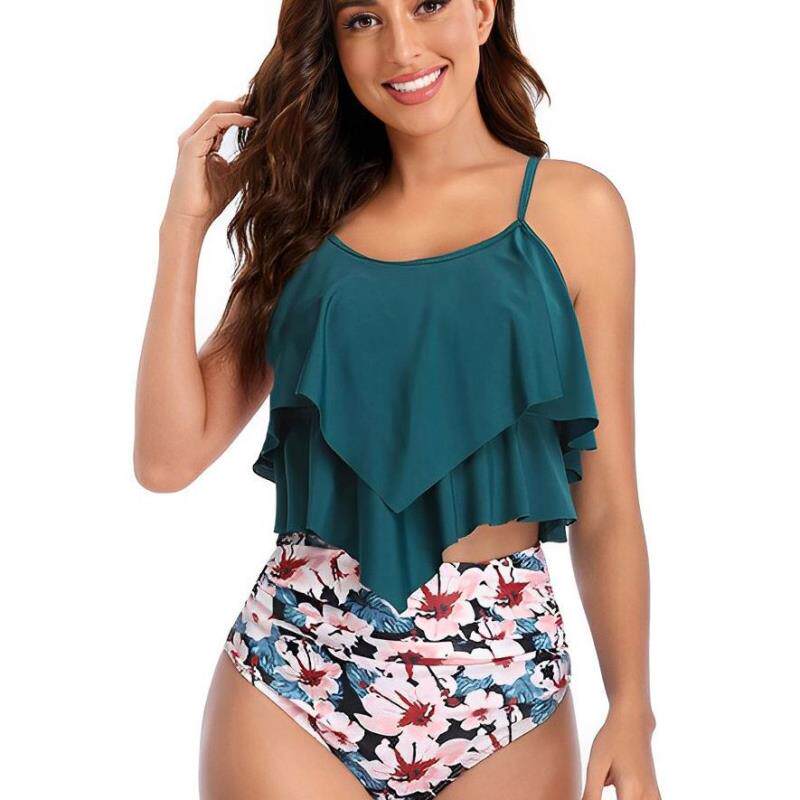 欧美跨境外贸新款高腰两件套泳衣女亚马逊荷叶边保守分体比基尼女