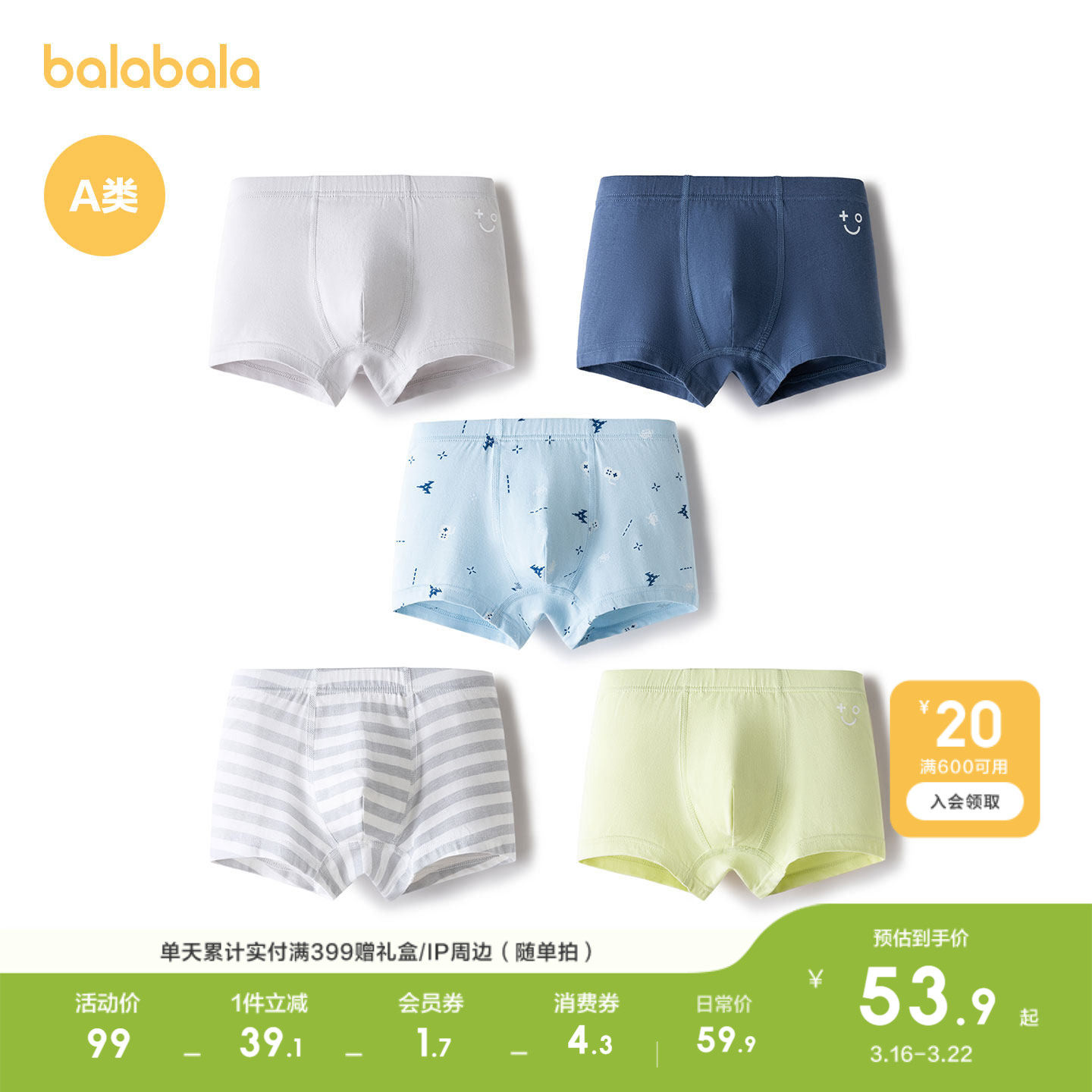 巴拉巴拉儿童内裤棉a类男童平角短裤小童中大童柔弹四角裤五条装