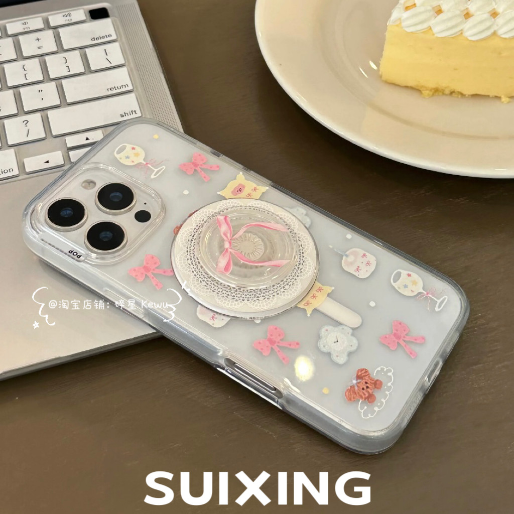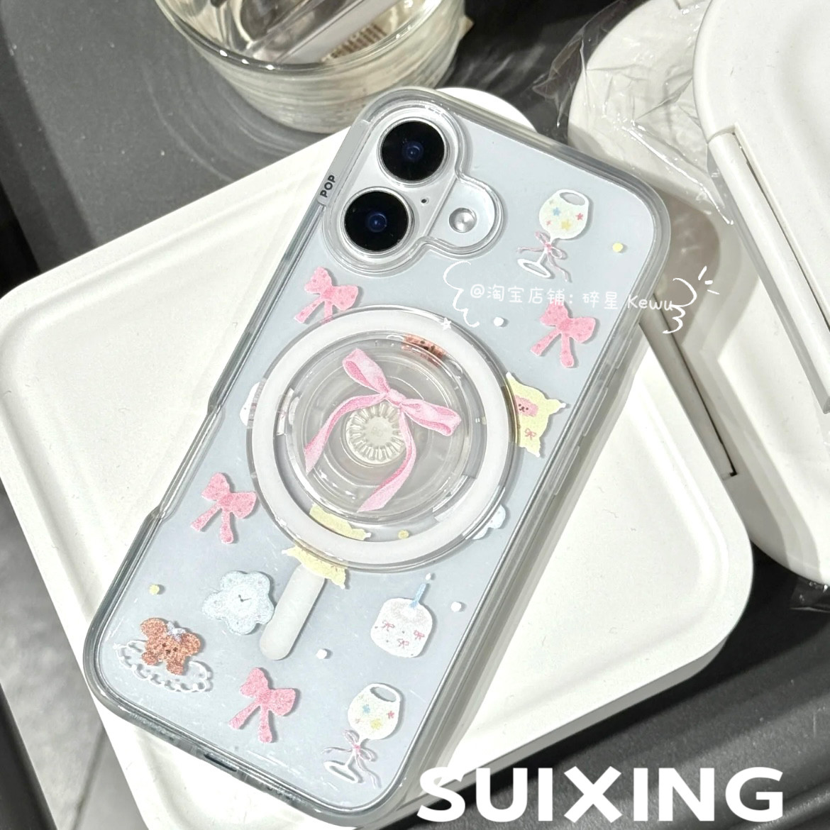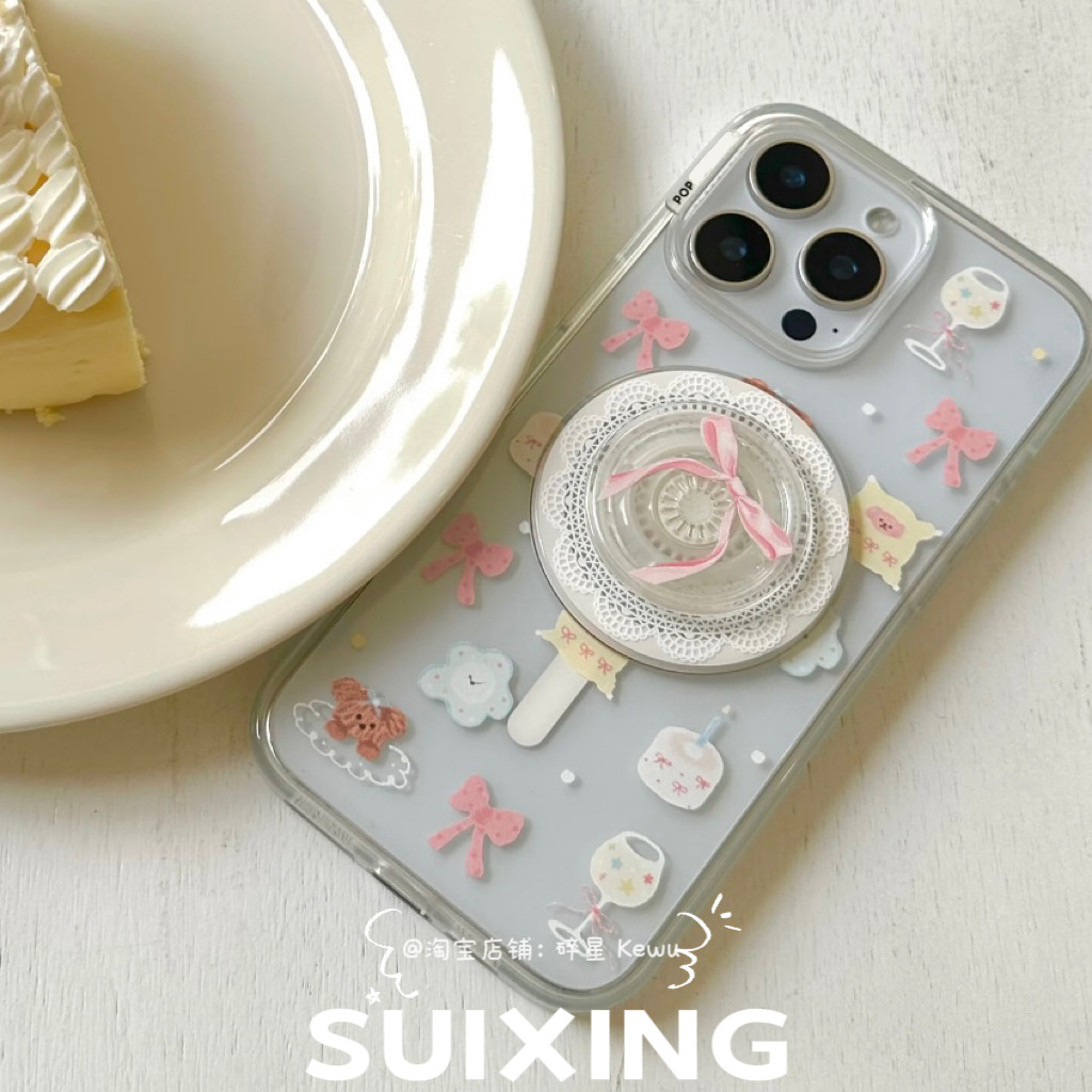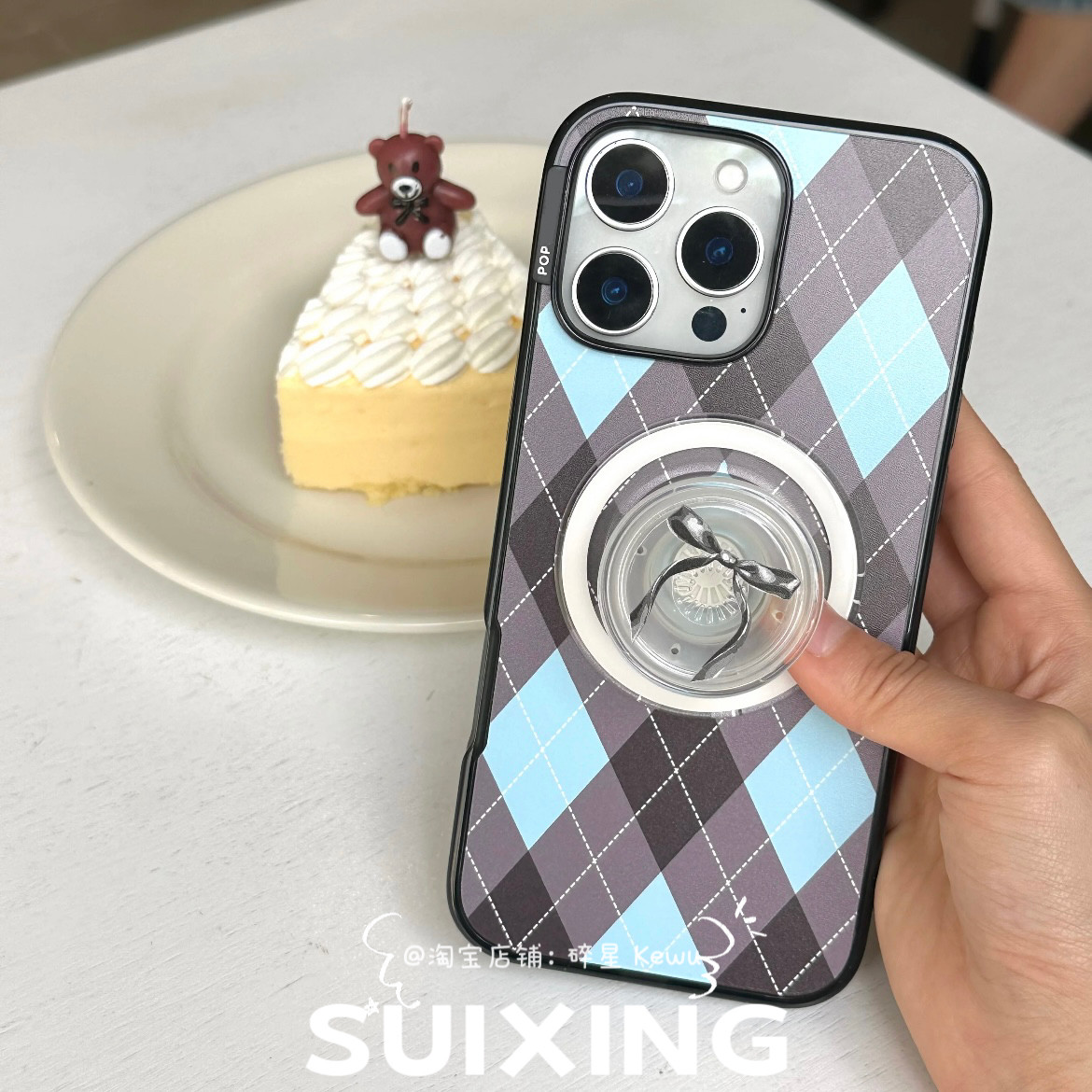 Suixing 泡泡骚灰蓝菱格纹蝴蝶结粉色透明16promax磁吸手机壳15pro轻薄高级感14/13防摔带气囊啪嗒支架保护套