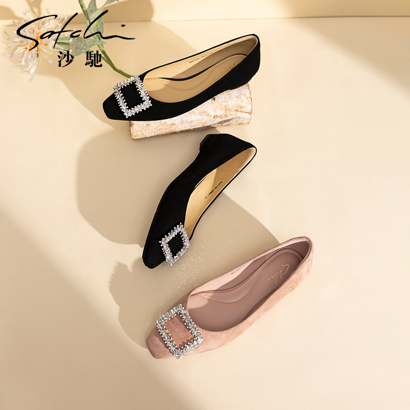 沙驰女鞋法式复古方头单鞋2025秋季新款水钻方扣浅口平底鞋不累脚