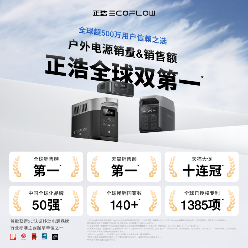 正浩EcoFlow 德DELTA3Plus 1度电1800瓦闪电快充大功率磷酸铁锂 户外移动电源便携 露营车载停电应急