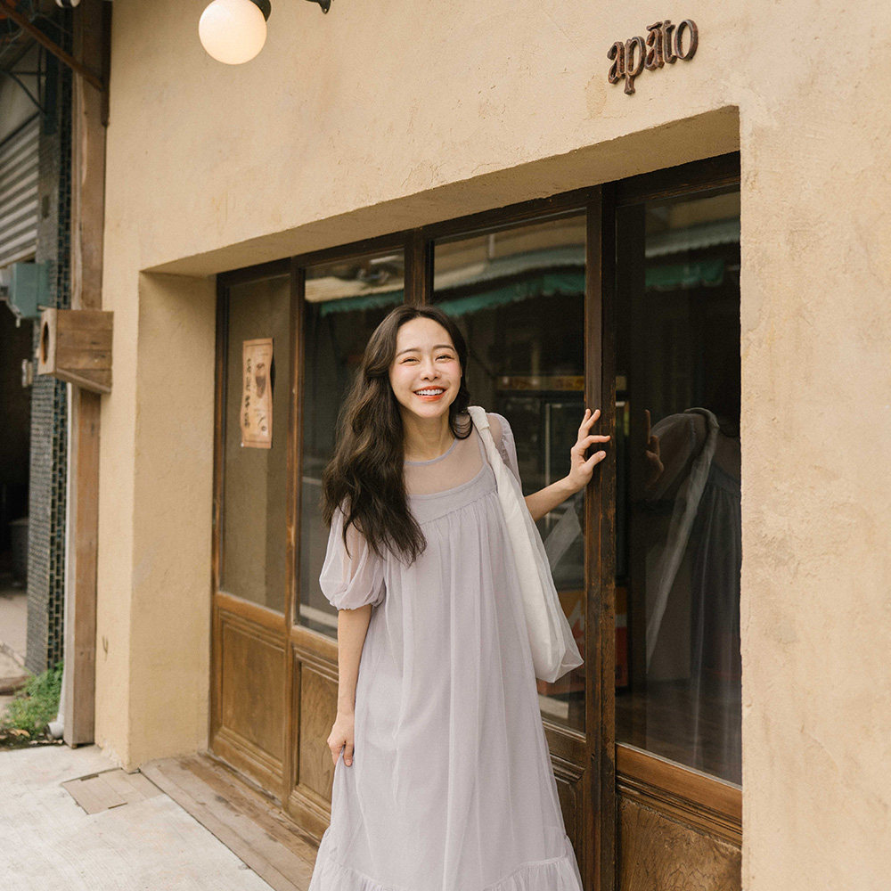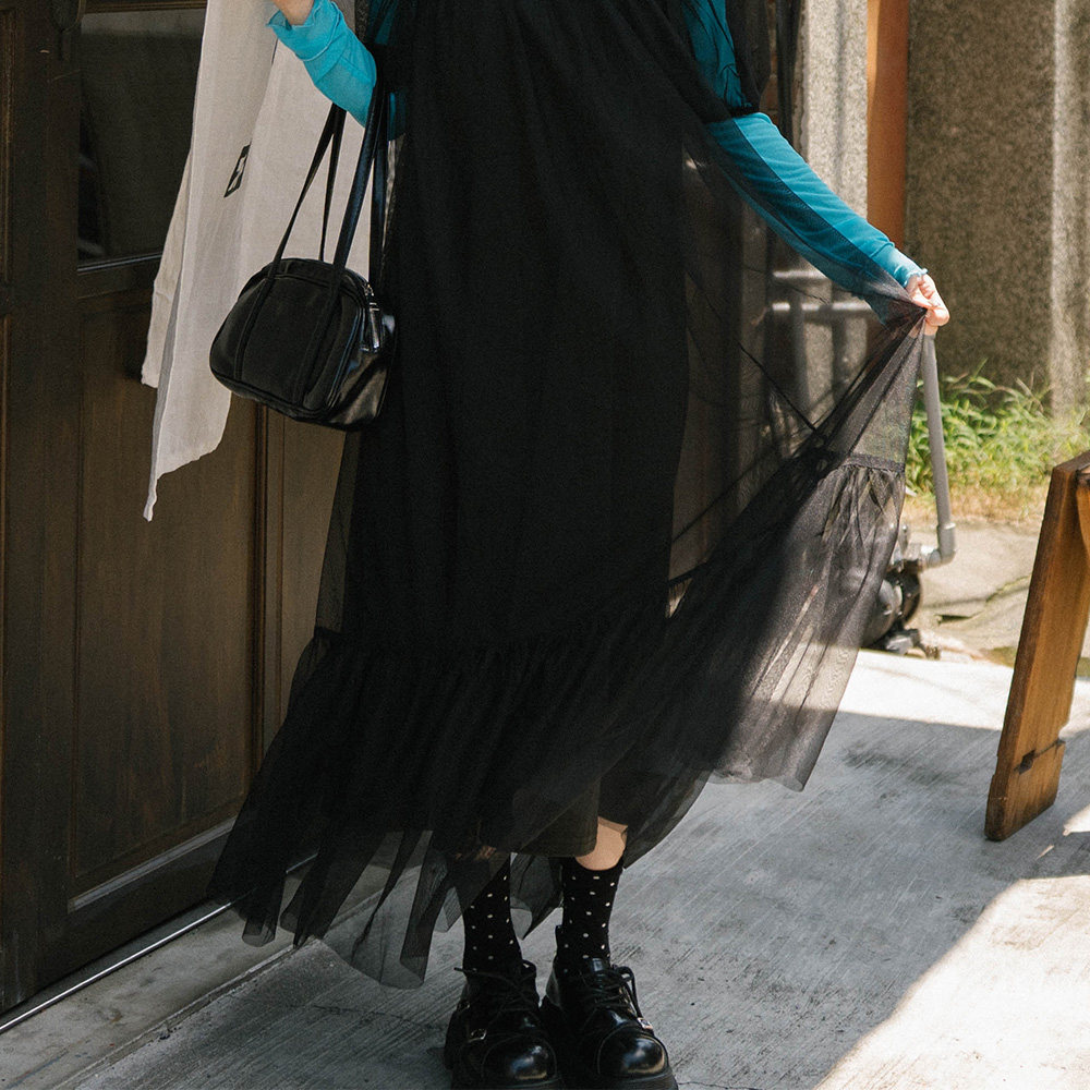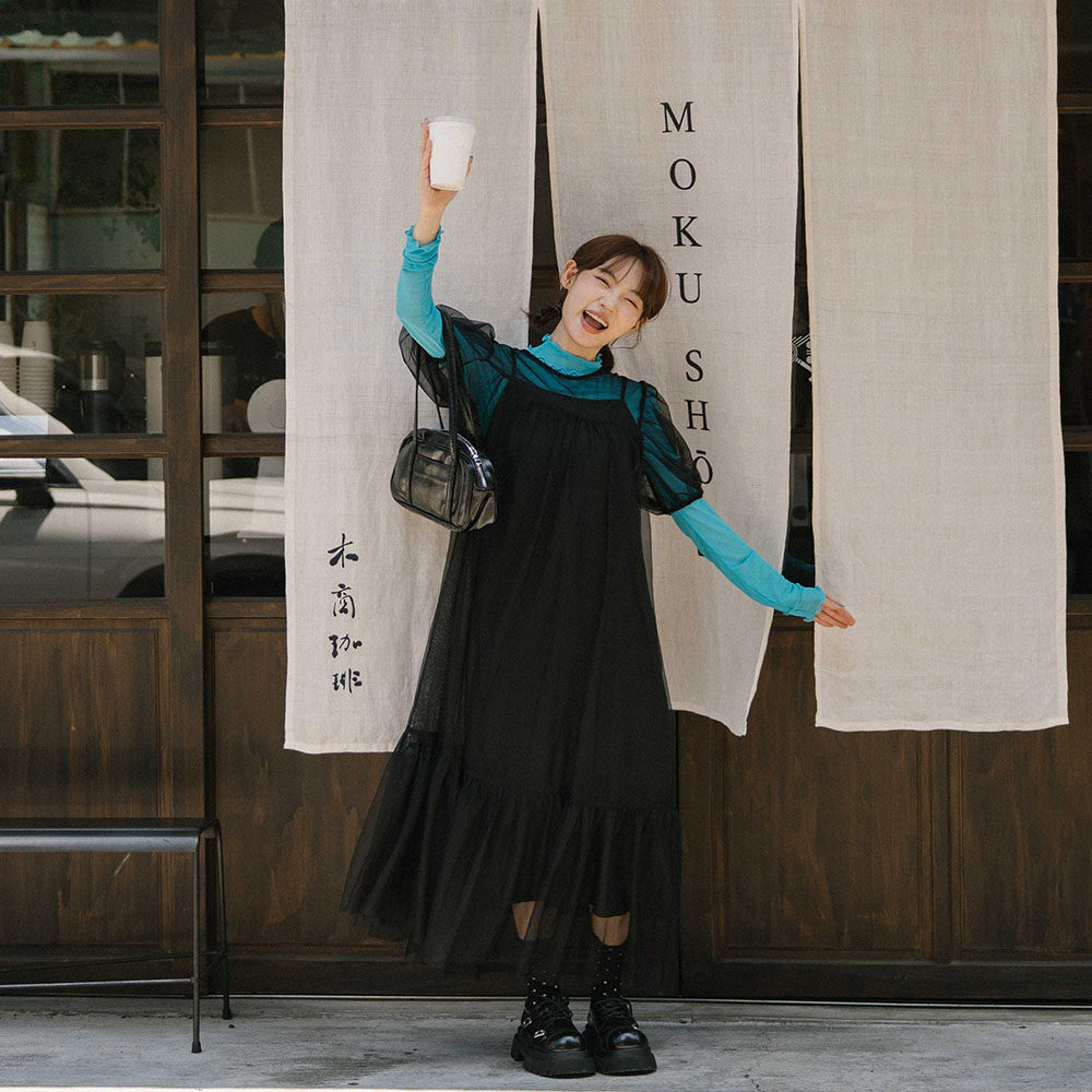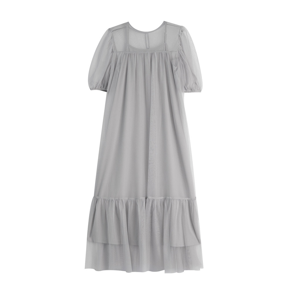 QUEENSHOP 2025秋冬新品女装澎袖造型网纱两件式长连衣裙01087146
