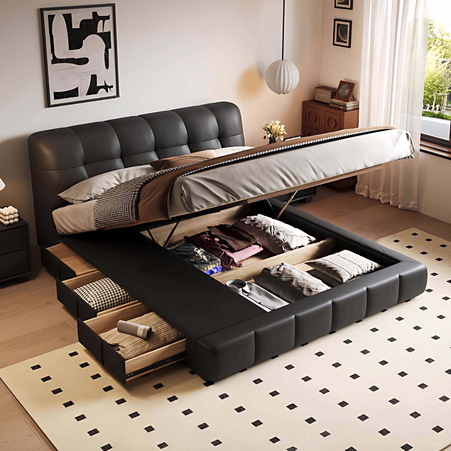 现代简约泡芙床复古奶油风主卧双人床意式极简中古风储物皮艺床