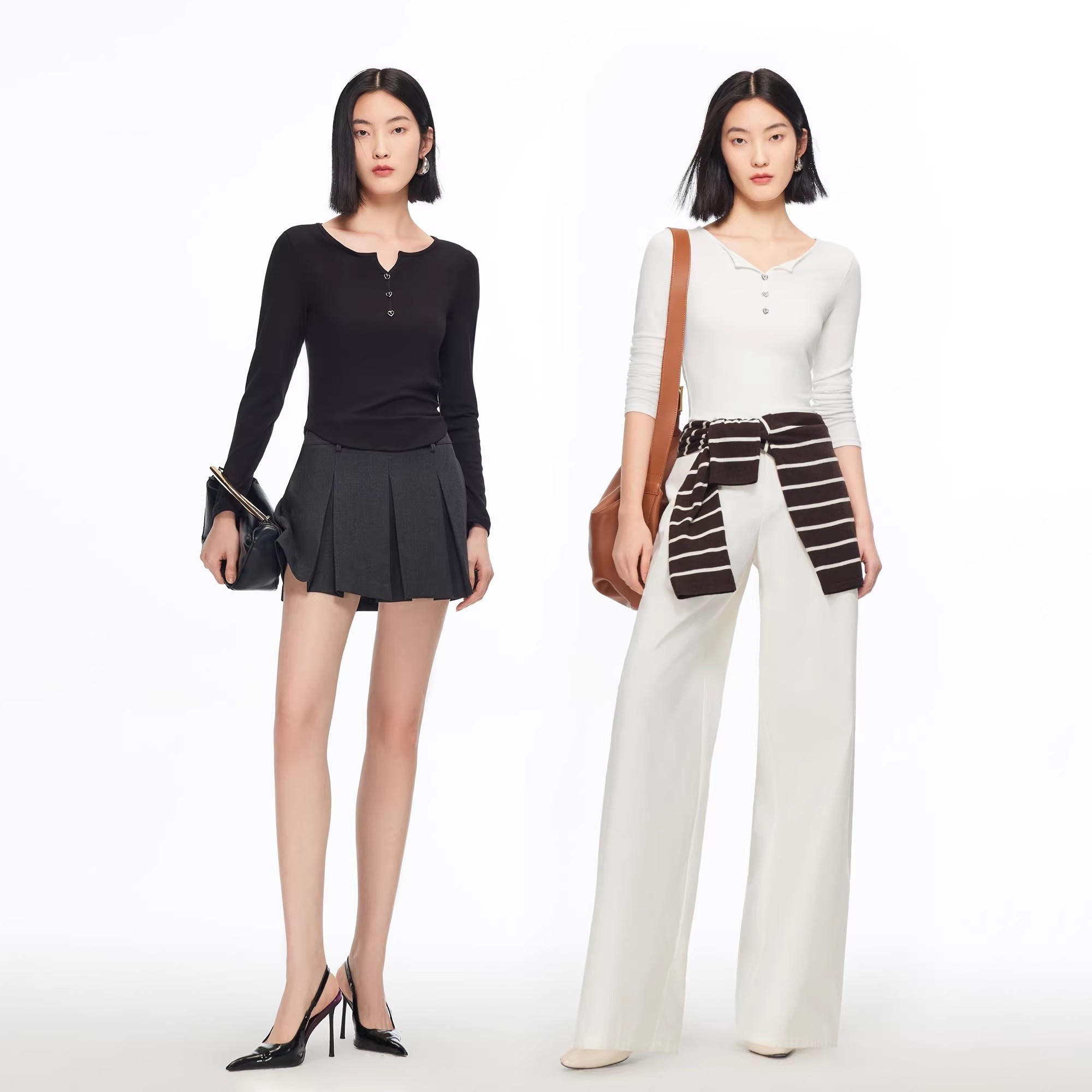 蕉下亨利衫女长袖T恤v领秋冬修身保暖低领打底衫半开领白色上衣
