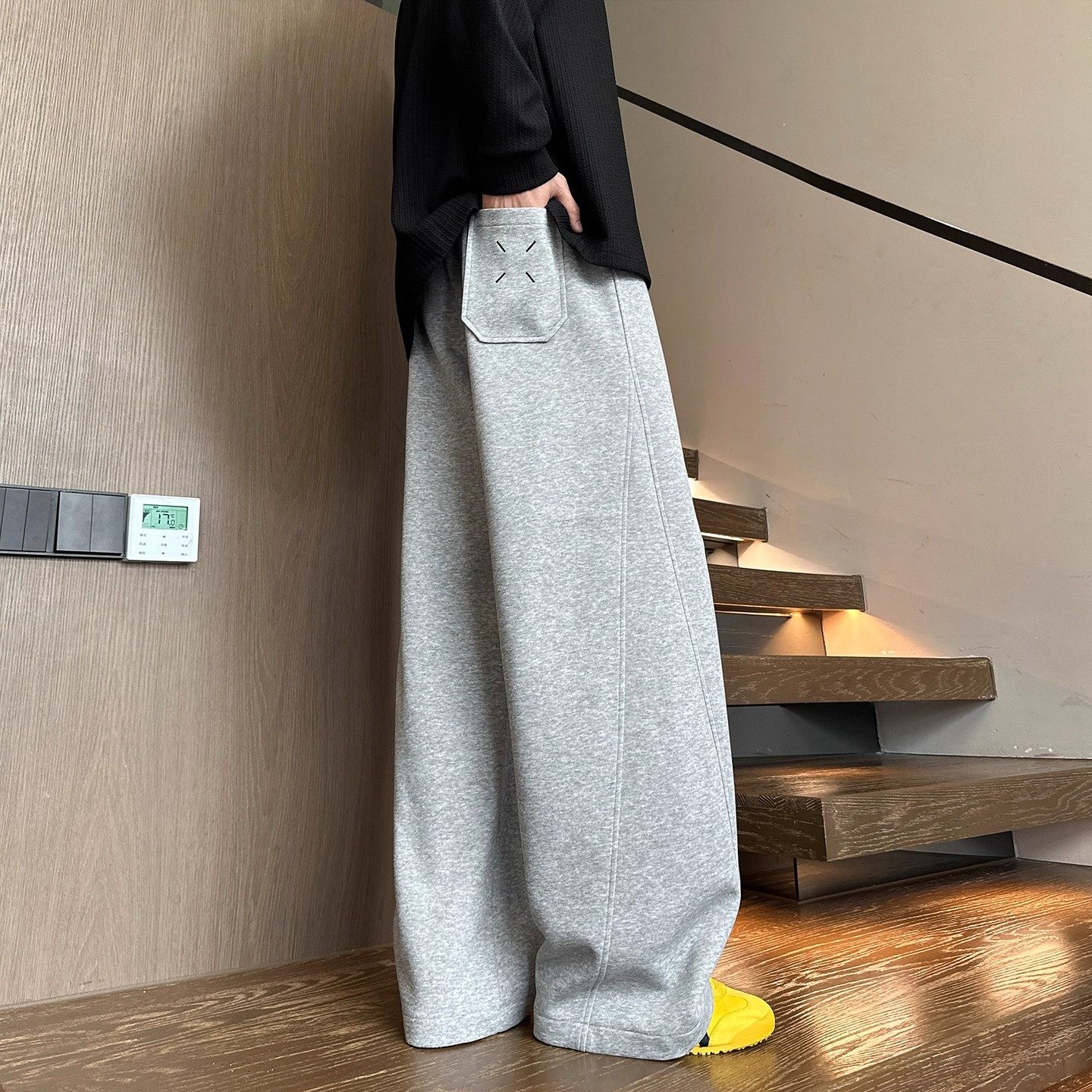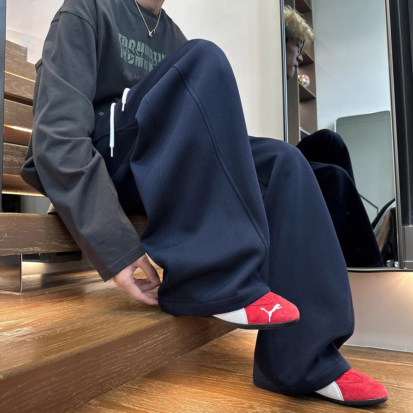 藏青色斜切弯刀卫裤男秋冬加绒加厚宽松阔腿运动裤子垂感休闲长裤
