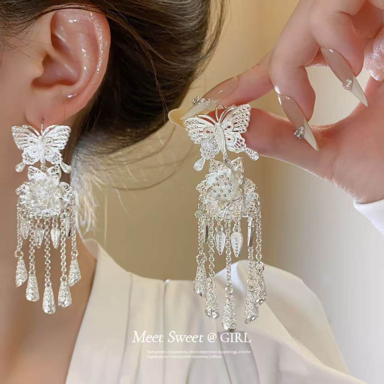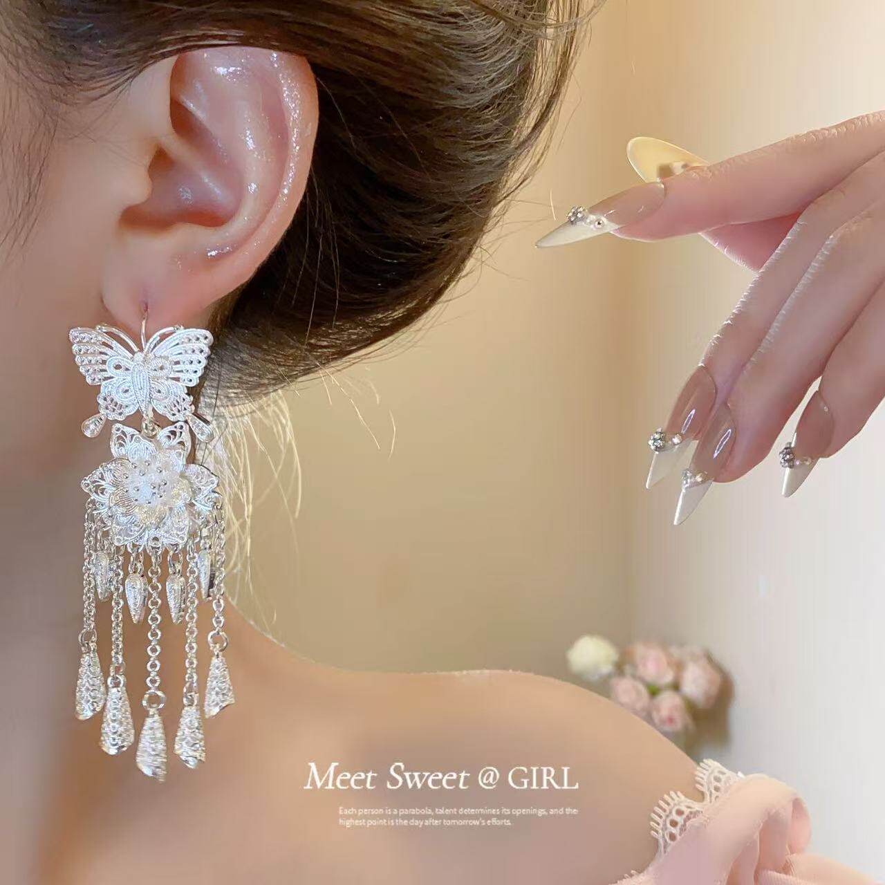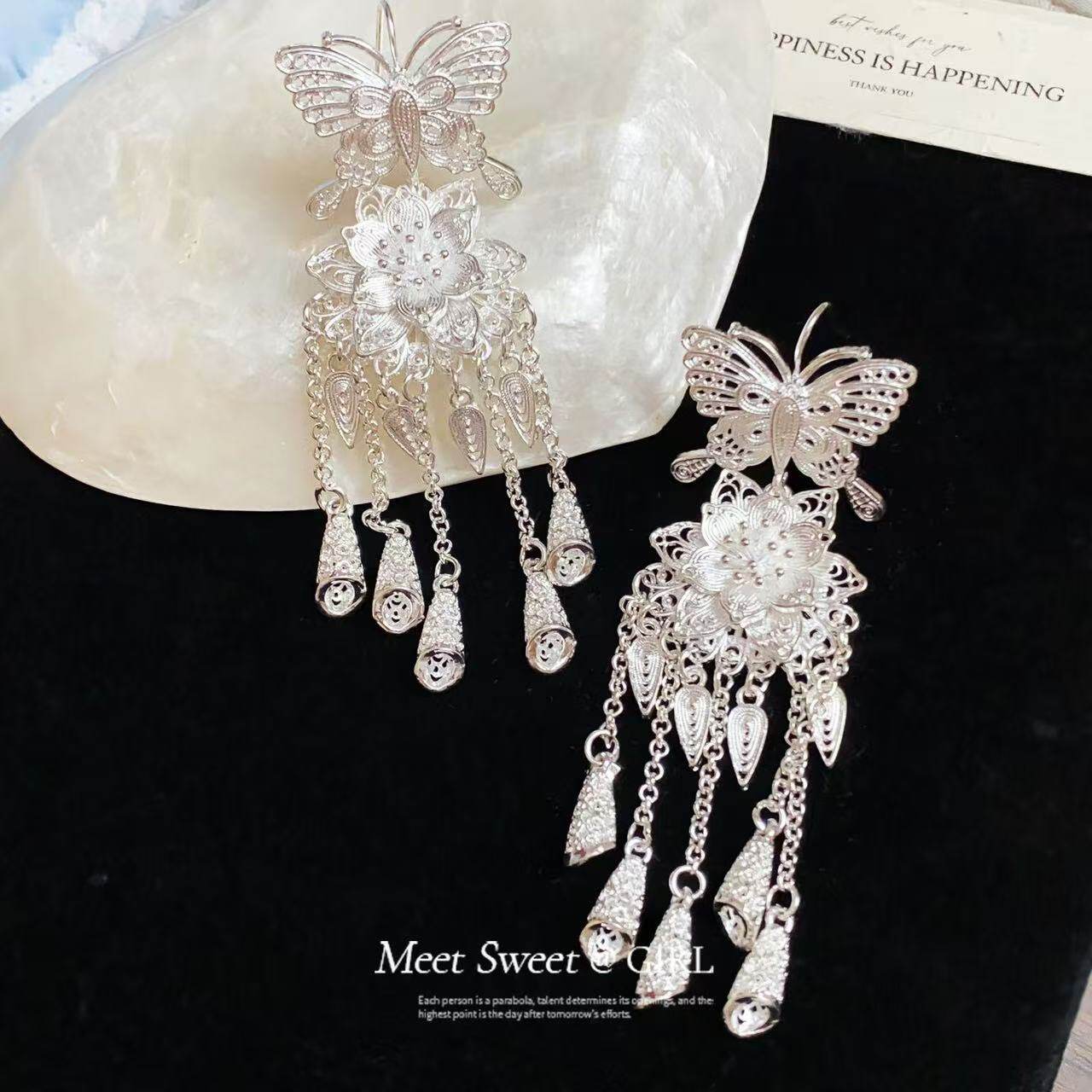 异域民族风花丝蝴蝶苗族耳环复古长款小众漂亮耳饰女银色耳坠耳钉
