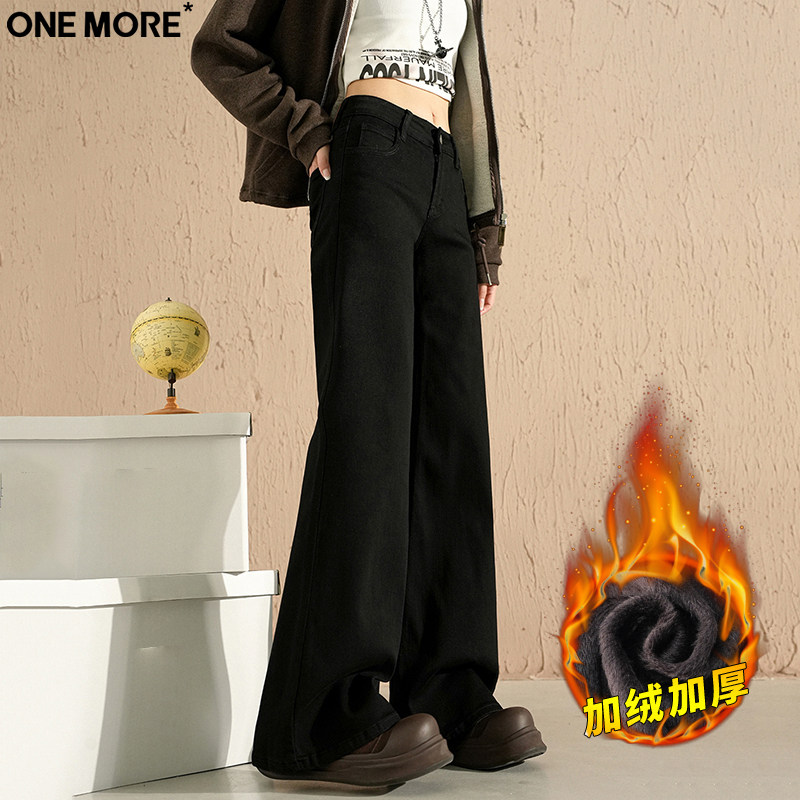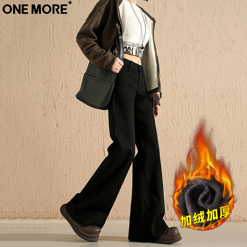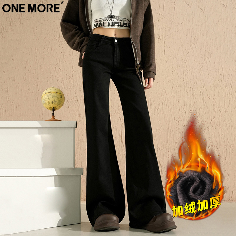 One More美式低腰微喇加绒牛仔裤女冬季保暖加厚弹力黑色喇叭裤子