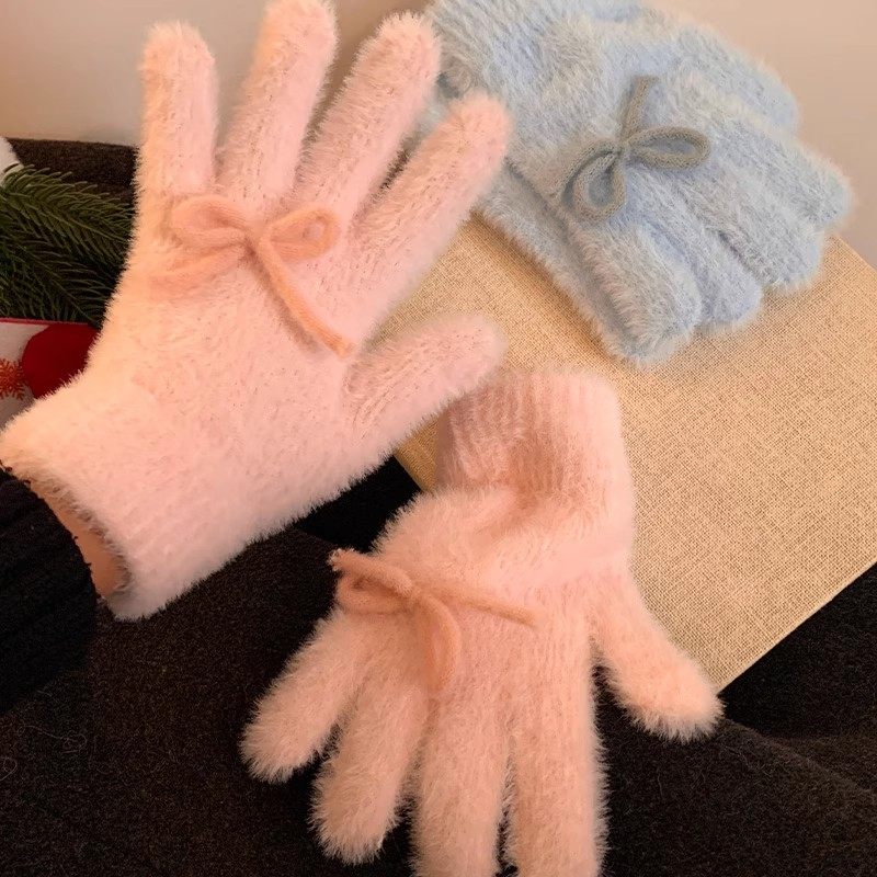 韩系可爱蓝色蝴蝶结针织毛绒手套女冬季加绒保暖防寒分指毛茸茸