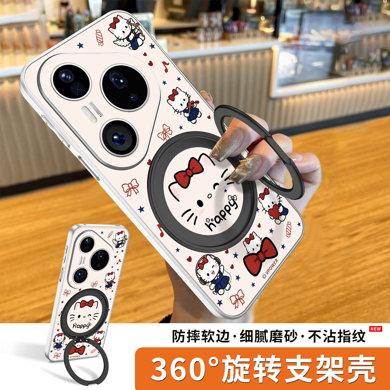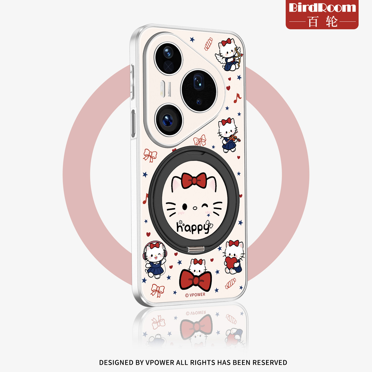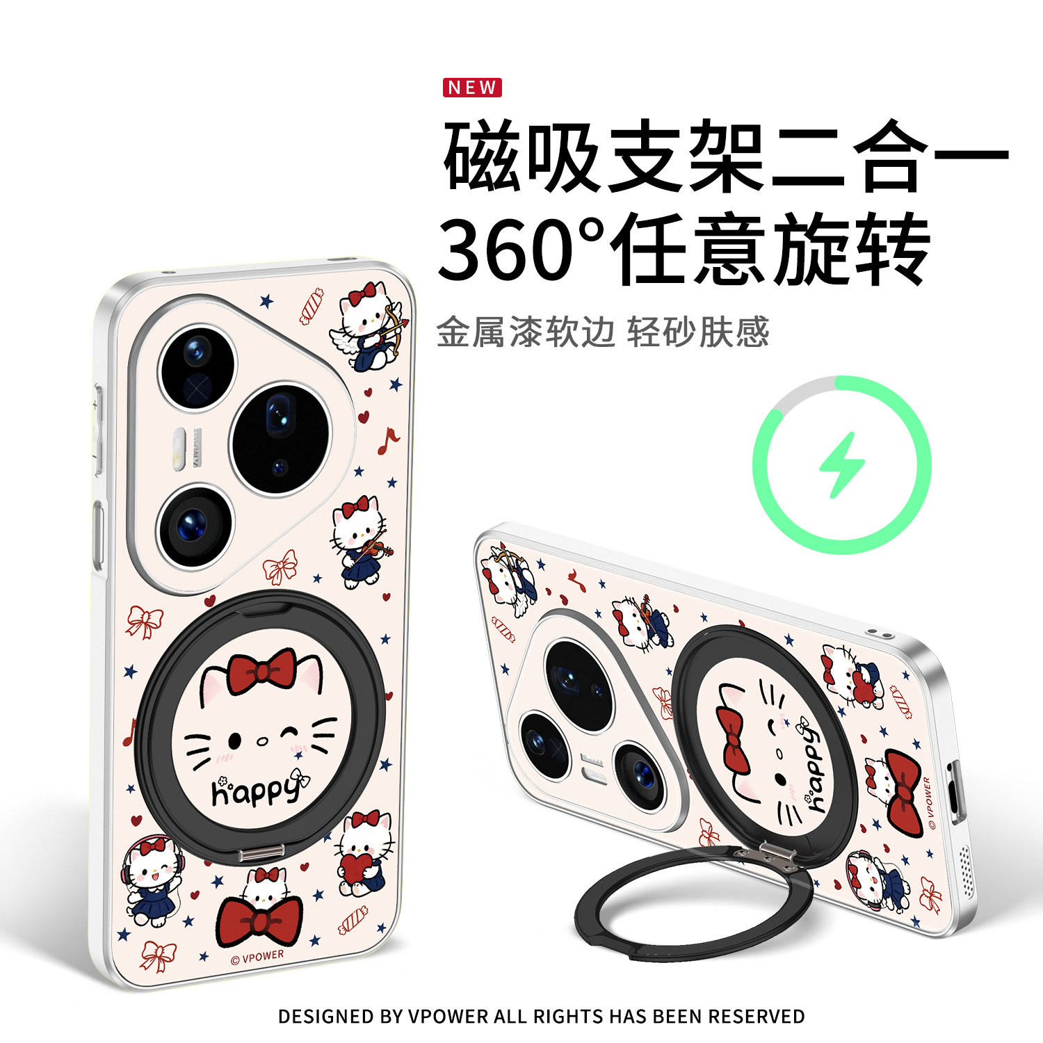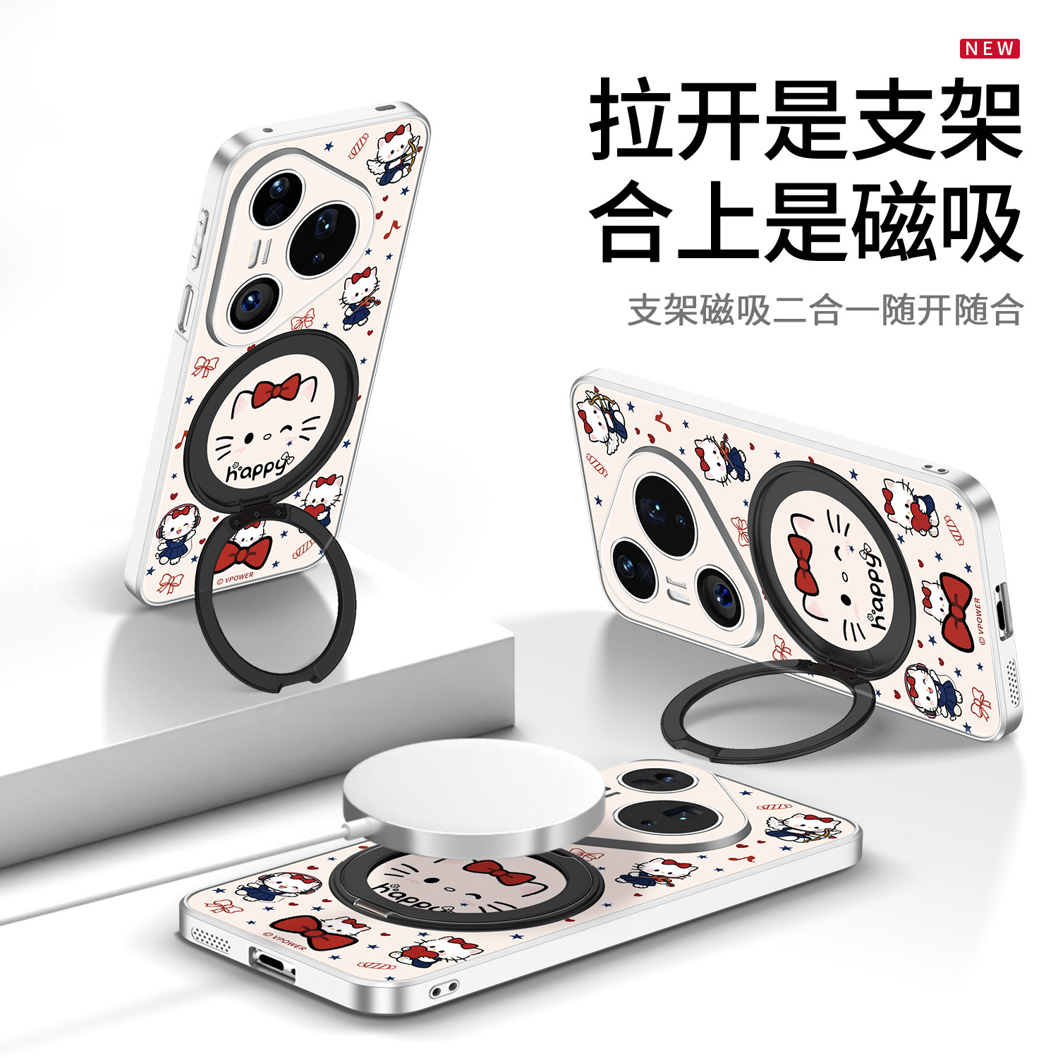蝴蝶结小猫适用华为pura80手机壳P80pro新款磁吸支架P70ultra360度旋转外壳全包防摔保护套P70pro+腕带挂绳外