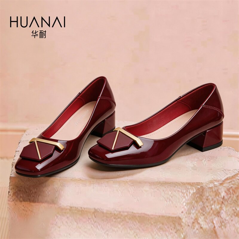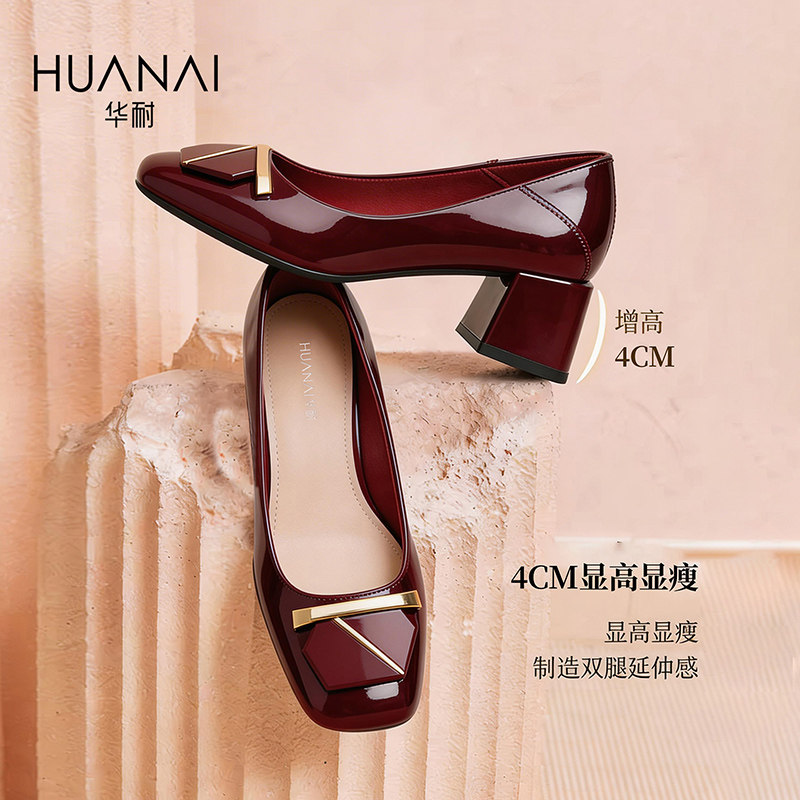 华耐红色单鞋女2026新款法式粗跟高跟女鞋喜婆婆婚宴鞋通勤妈妈鞋