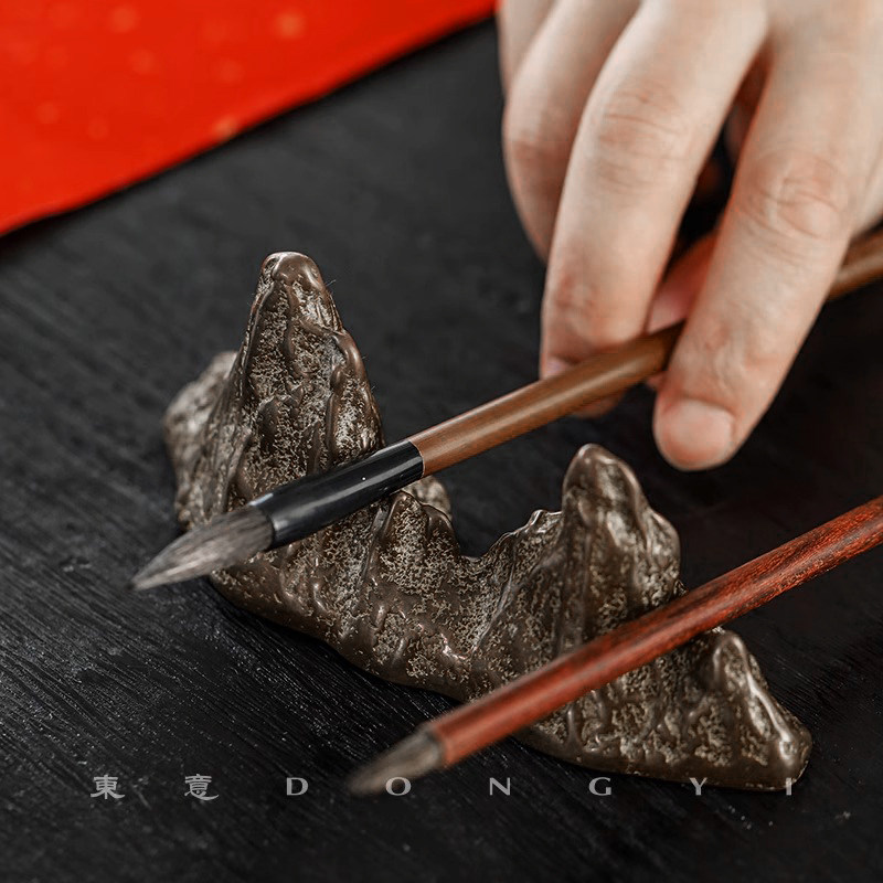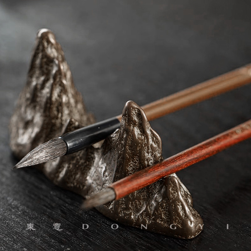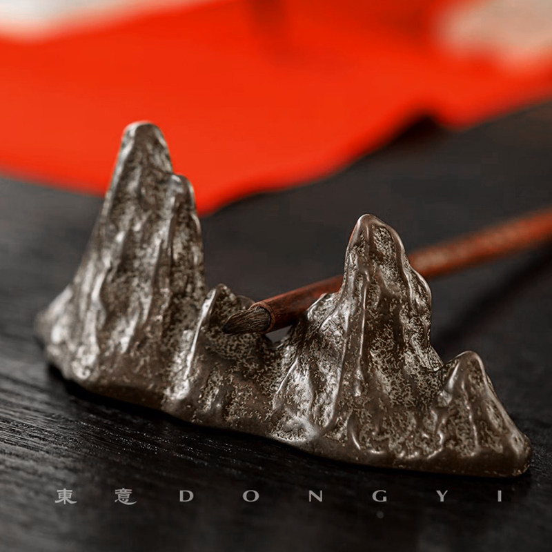 东意文房 复古实心铜山形黄铜镇纸假山毛笔笔架 笔搁书镇尺摆件