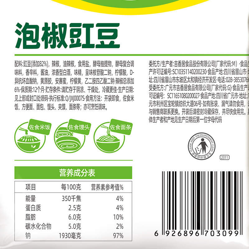 吉香居80g泡椒豇豆四川下饭菜开袋即食早餐配粥稀饭酸豆角