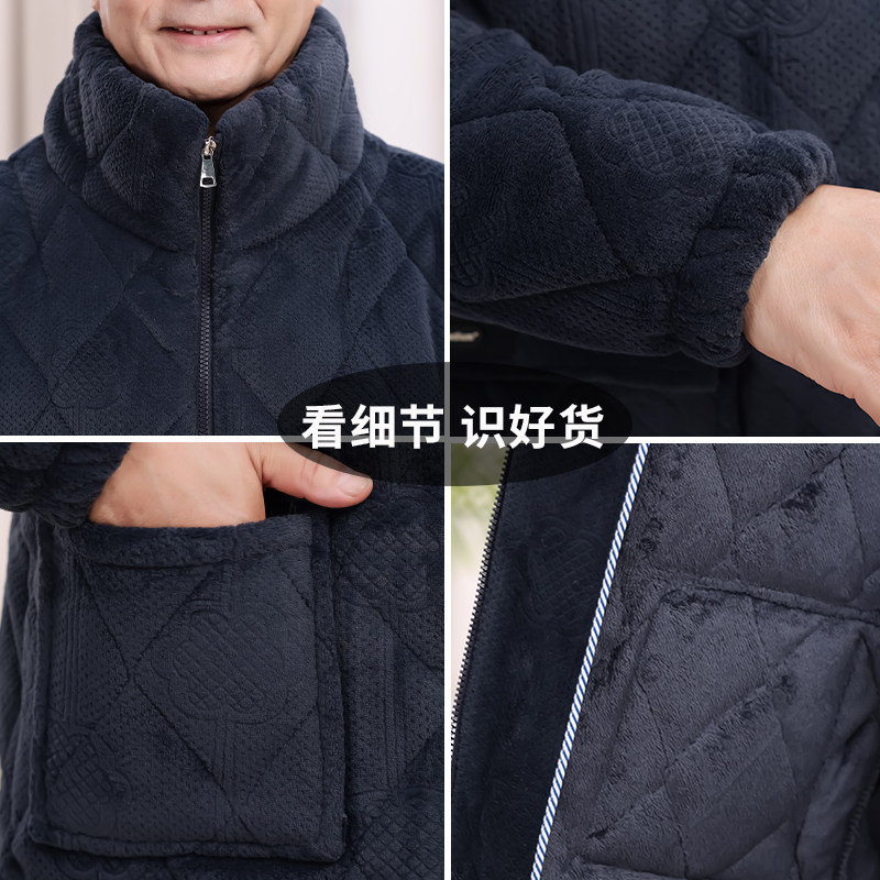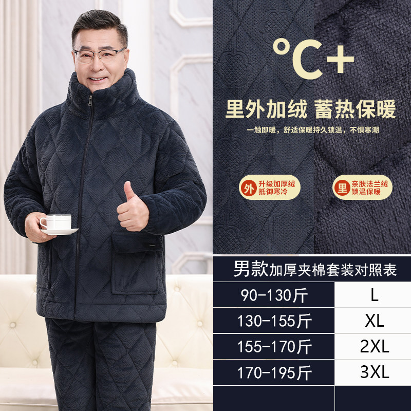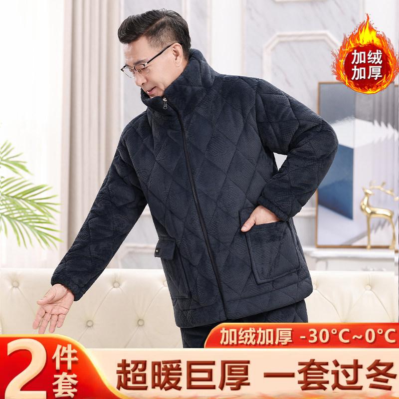 男士睡衣秋冬季三层加厚加绒珊瑚绒夹棉保暖中老年爸爸家居服套装