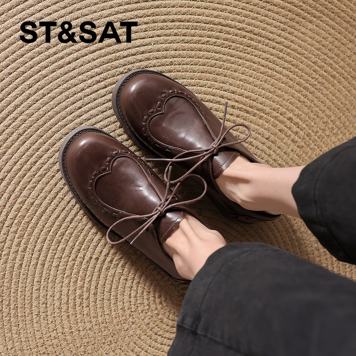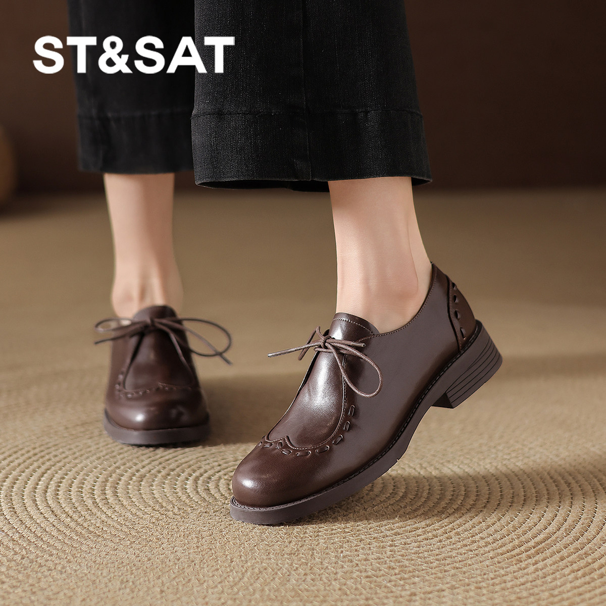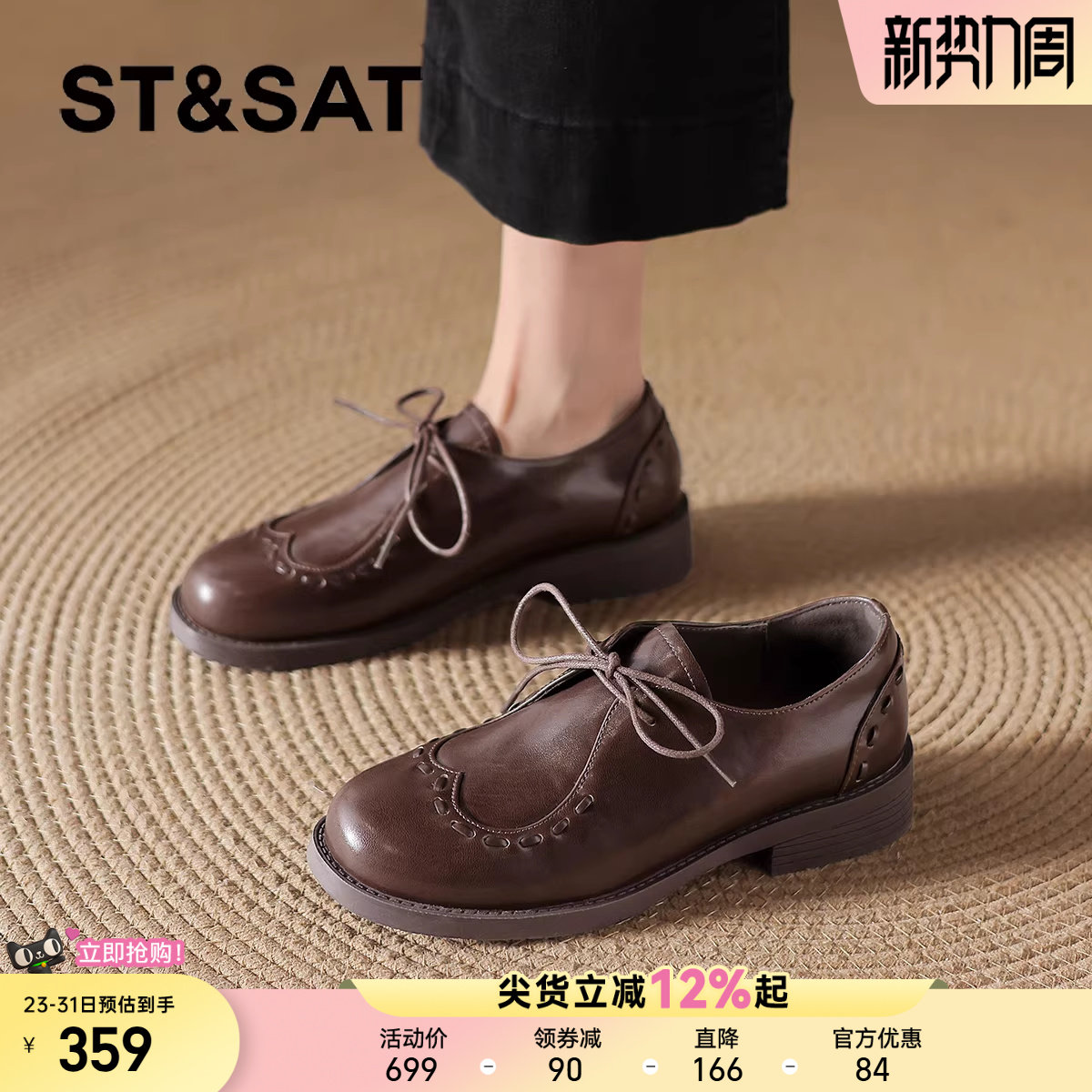 星期六棕色乐福鞋女新款春季厚底布洛克女鞋系带英伦小皮鞋