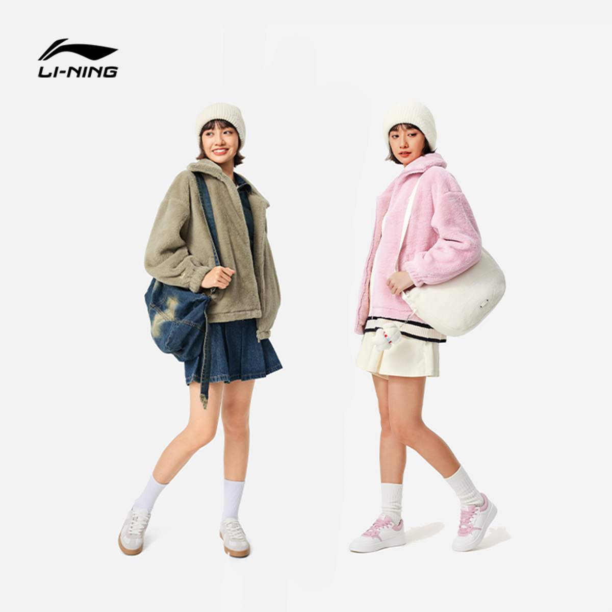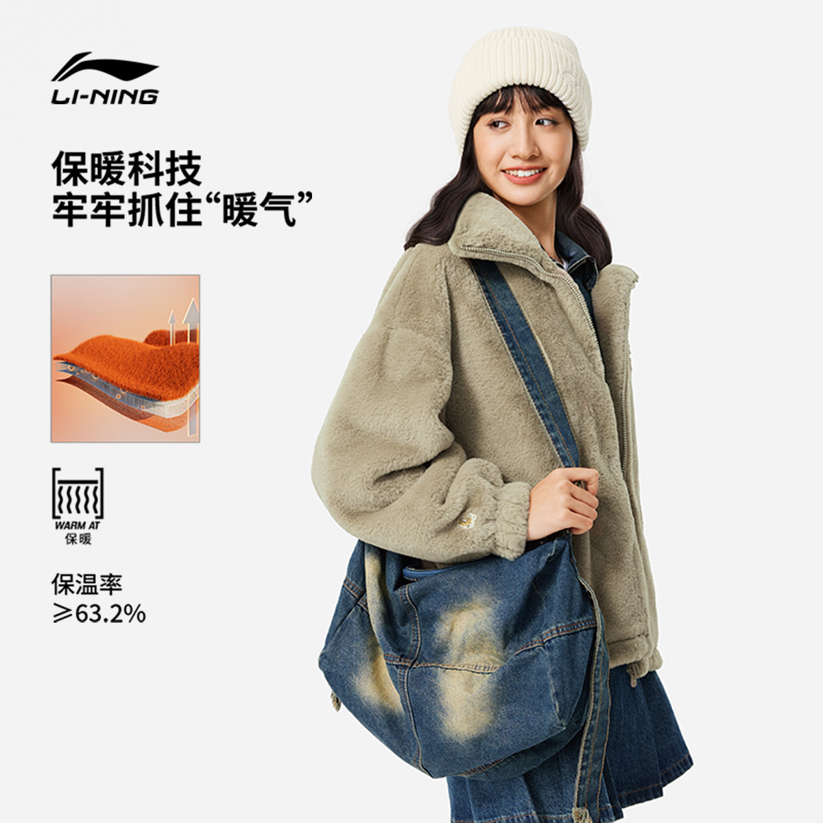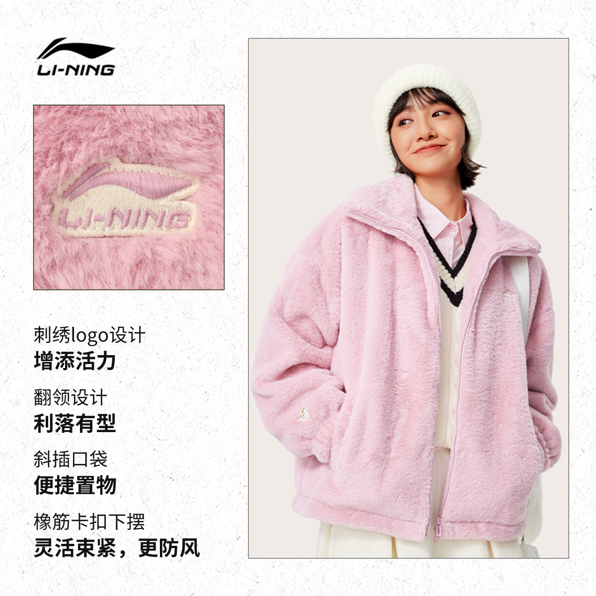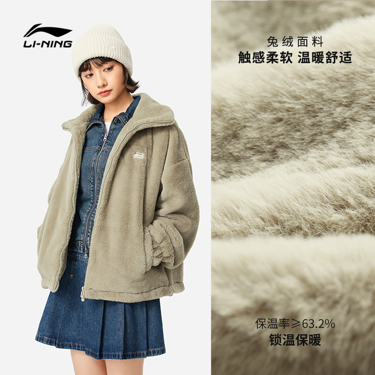 李宁仿兔毛绒外套女士春秋休闲翻领防风夹克宽松针织上衣运动服