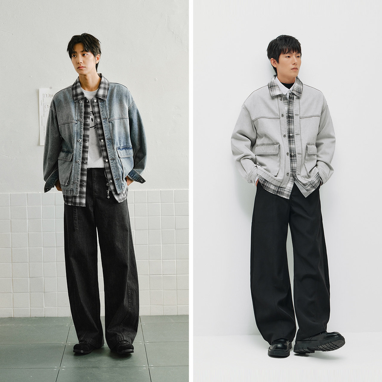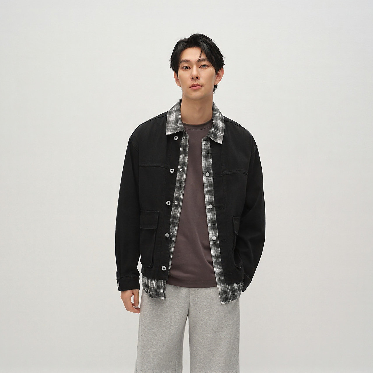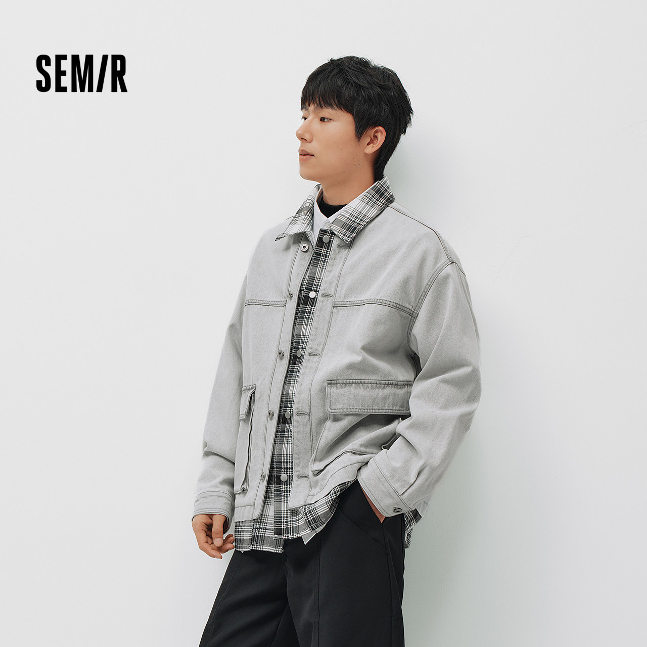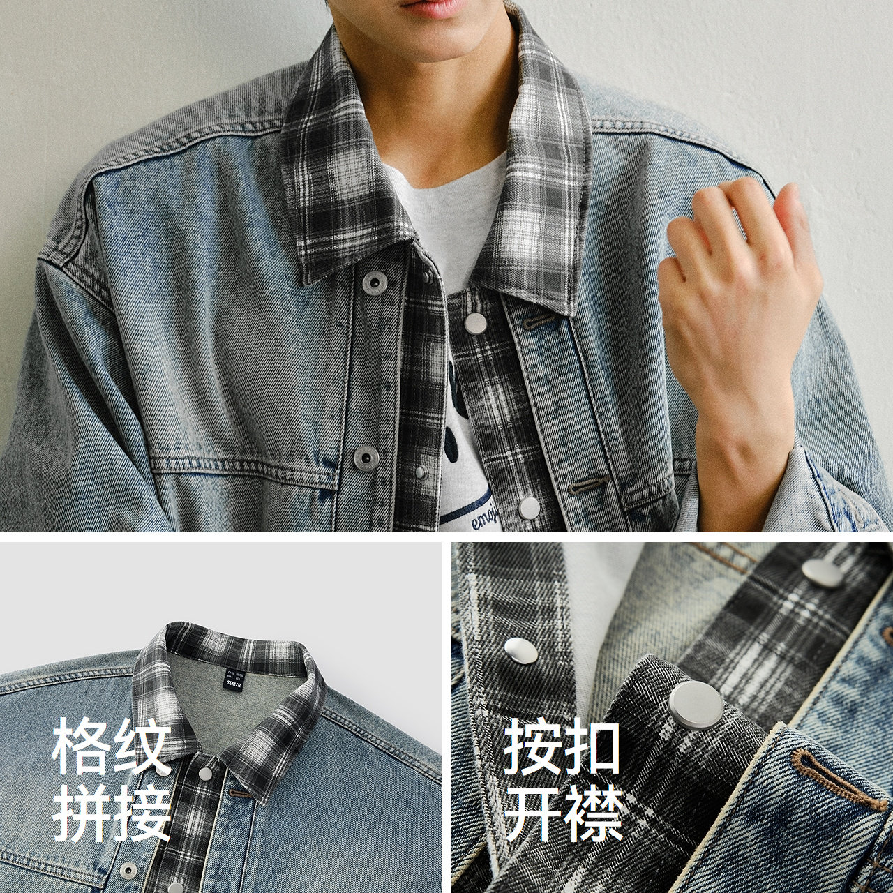 商场同款|森马夹克男春假两件拼接格纹牛仔外套2026新款翻领上衣