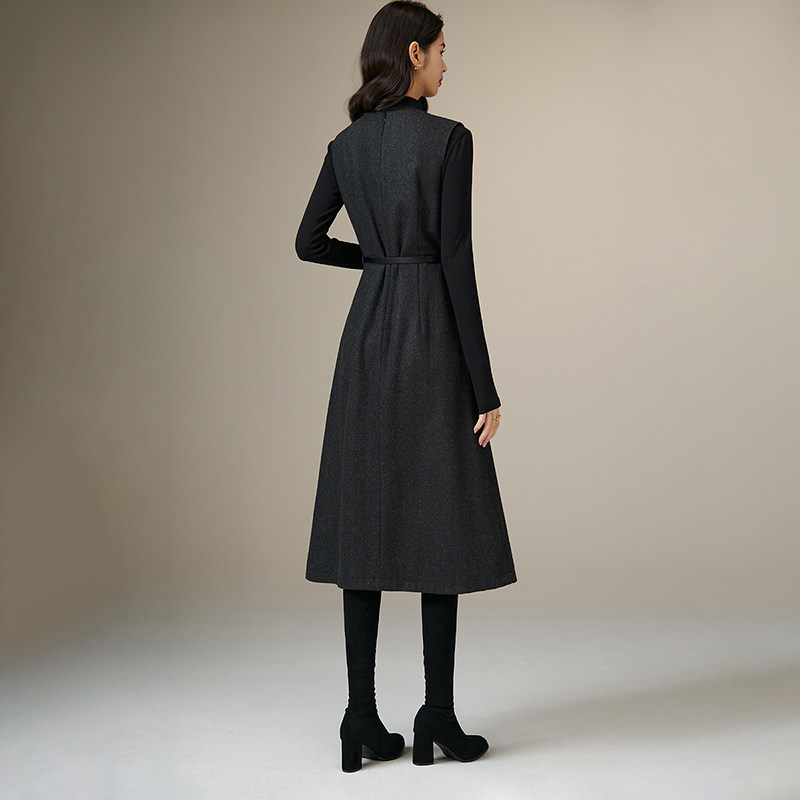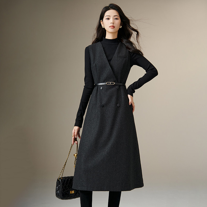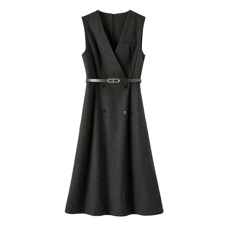 晚白2025年秋冬新款气质V领绵羊毛裙子收腰时尚百搭无袖连衣裙