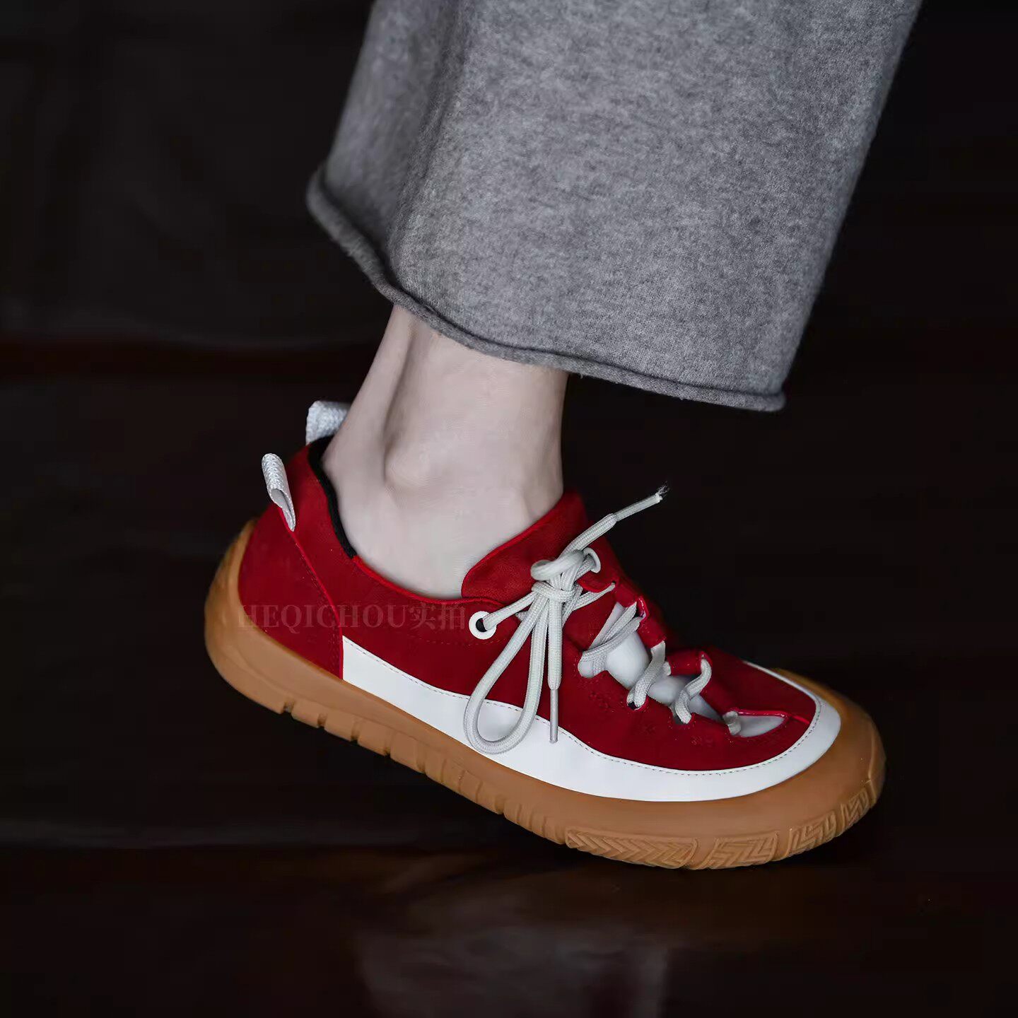 红色圆头系带德训鞋女软底新款厚底百搭户外运动休闲鞋平底女鞋