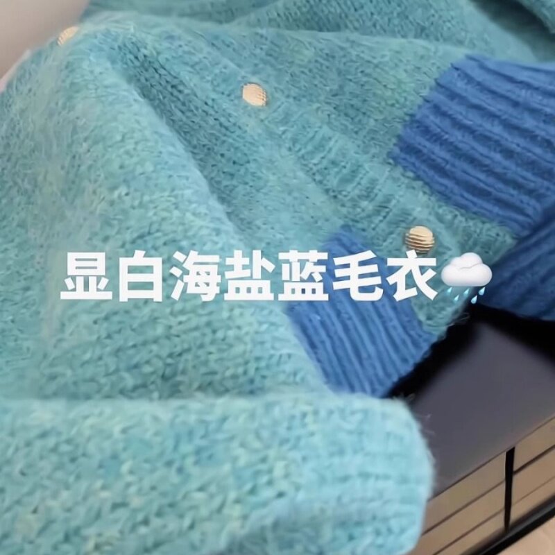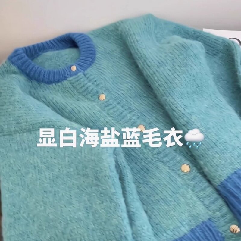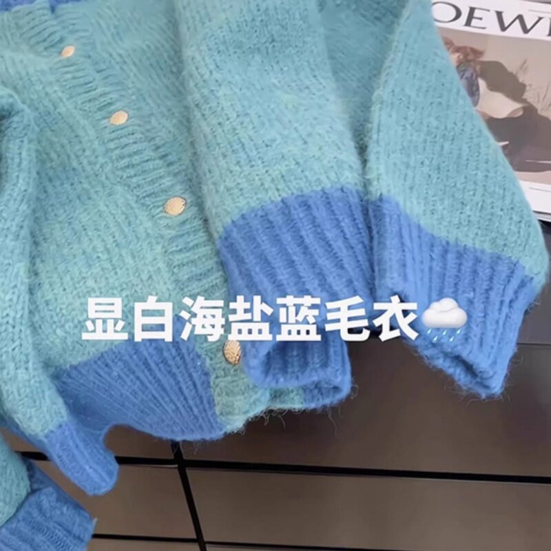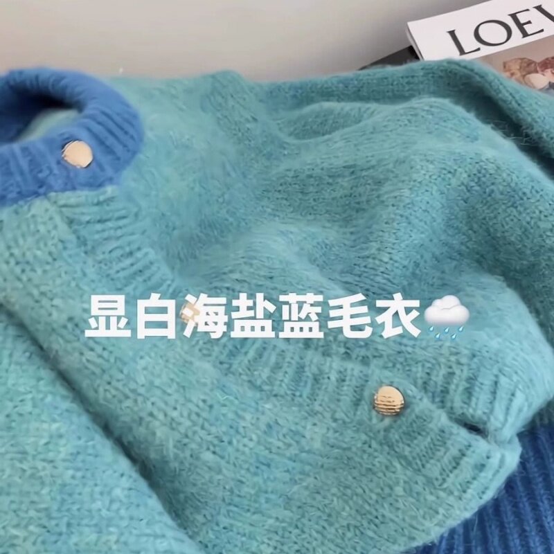 蓝色圆领针织开衫毛衣女秋季马海毛软糯中老年短款外套长袖上衣秋
