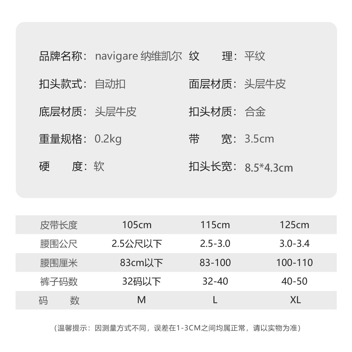 Navigare纳维凯尔意大利小帆船男真皮腰带自动扣男士头层牛皮皮带